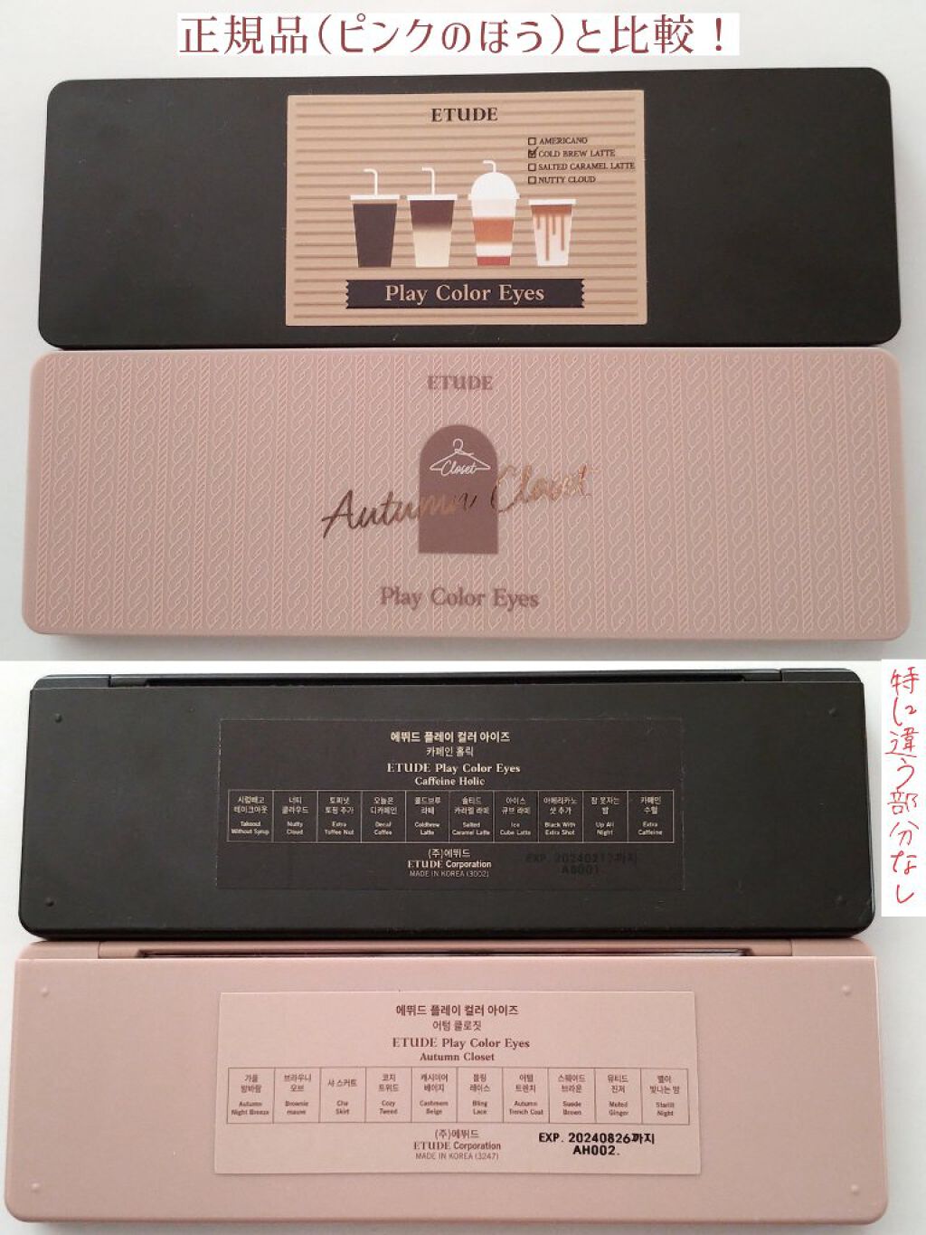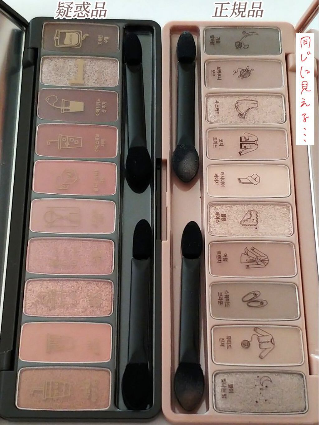 全っっぜん箱のデザインが違ったんですよー!🙀 あと何気にケースのデザインも微妙に違う。 Qoo10はかなり偽物が横行してるのは知ってたんですけど、 「こんな大胆にパッケージ変えるってバレるリスク高すぎでは」 パッケージがリニューアルしていることが確認できました!🥳 私は、既に持っていたオータムクローゼットと比べてアイシャドウの質が限りなく同じだと思ったので恐らく本物であると判断しました!