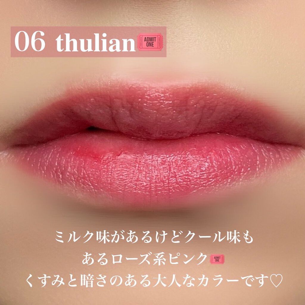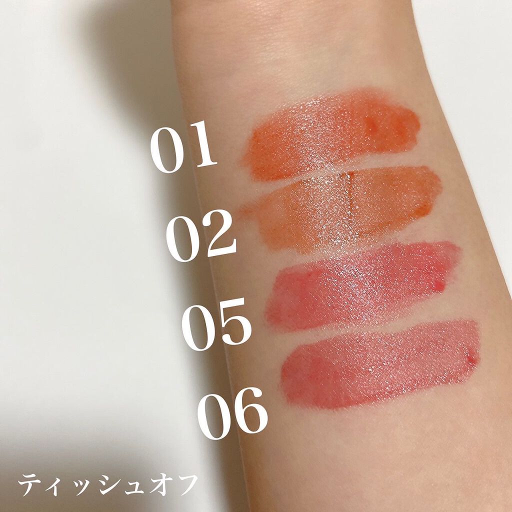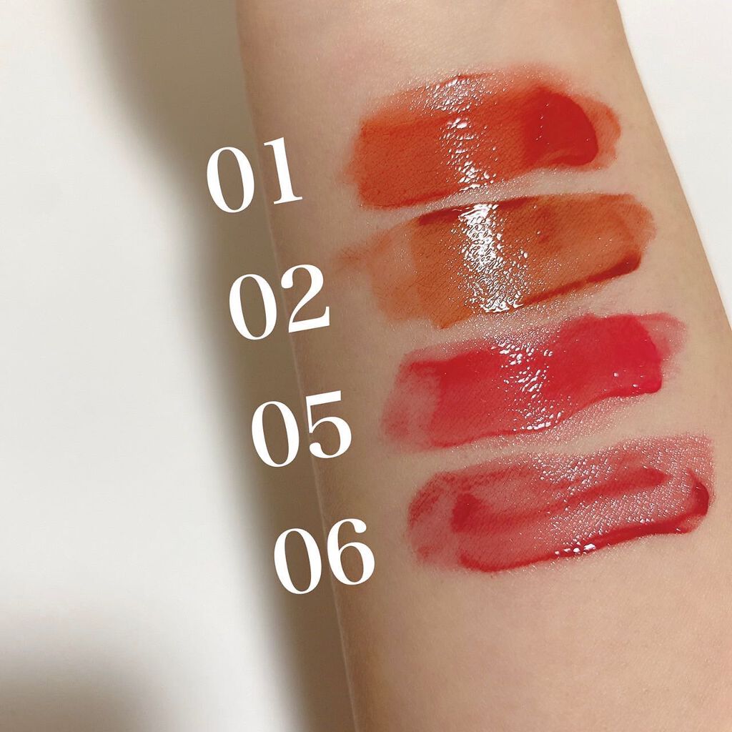 サラッとしたテクスチャーで薄膜仕上がり。ベタつきにくくじゅわっとみずみずしい発色のティントリップです。 ころんとしたパケも可愛い!アプリケーターもぽてっとしてるんですが安定感があって塗りやすいです◎ 明るめ得意なブルベ夏の私は02と04が特に気に入っています😍