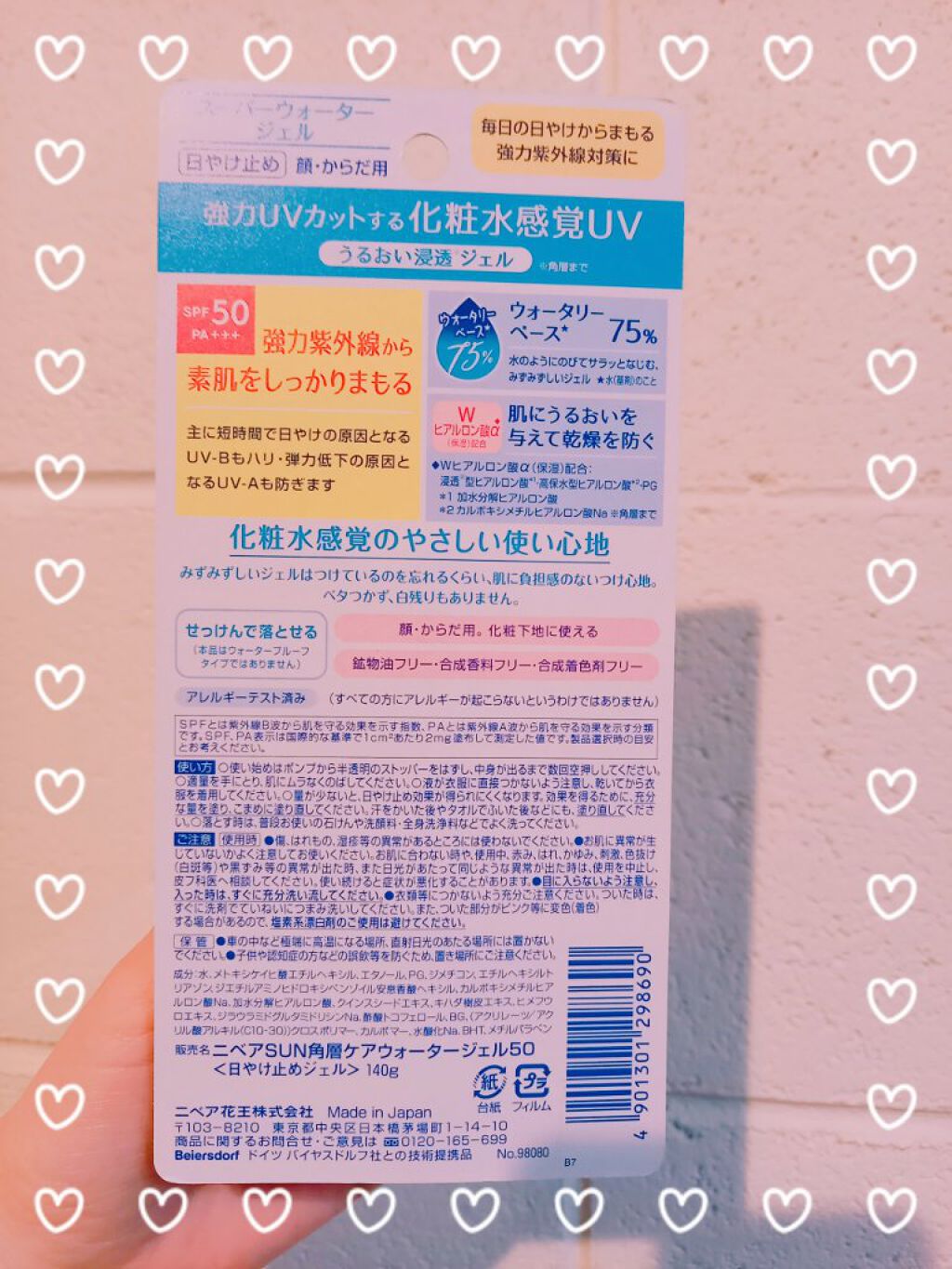 - ◆化粧水感覚UV。強力紫外線から素肌をしっかりまもるジェル。 SPF50/PA+++。肌にうるおいを与えて乾燥を防ぎます。 ウォータリーベース*75%のスキンケアUV ◆水のようにのびてサラッとなじむ、みずみずしいジェル。肌に負担感のないつけ心地 ◆いつもお使いの石けんや洗浄料で落とせます。顔・からだ用。化粧下地にも使えます。鉱物油フリー・合成香料フリー・合成着色剤フリー。 ◆本品はウォータープルーフタイプではありません *水(基剤)のこと