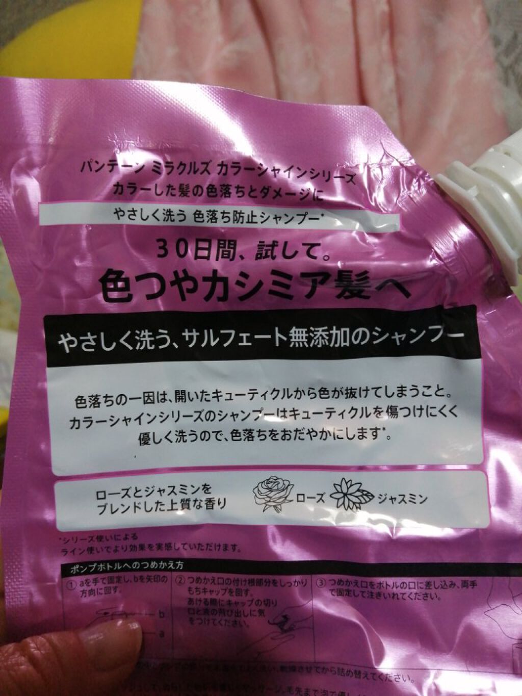 カラーした髪に。ダメージケアして色落ちを防ぐ。 カラーしたのにすぐに色落ちしてしまう…その色落ちの一因は、髪に蓄積したダメージ。 髪色キープには、カラー後のダメージケアが大切。 PRO-V 処方+ボンドリペア成分 プロビタミンB5(パンテノール、パンテニルエチル(浸透性保湿成分))とボンドリペア成分を配合。 ピンクローズ&マンダリンオレンジの香り は、トップノートがマンダリンオレンジ、ミドルノートがピンクローズ、ベースノートがムスク の華やかでエレガントないい匂いです。