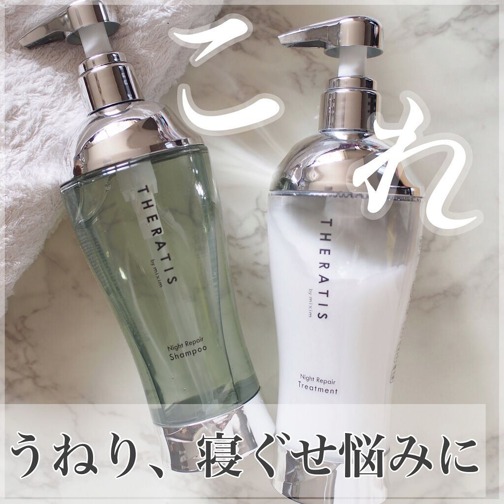 【THERATISbymiximナイトリペアシャンプー/ヘアトリートメント】寝ている間に補修成分がしみ込み、うねり・寝ぐせを抑制する新ナイトリペアヘアケアTHERATISbymixim❗️すでに使っているかな?90%以上が美容液成分というので...