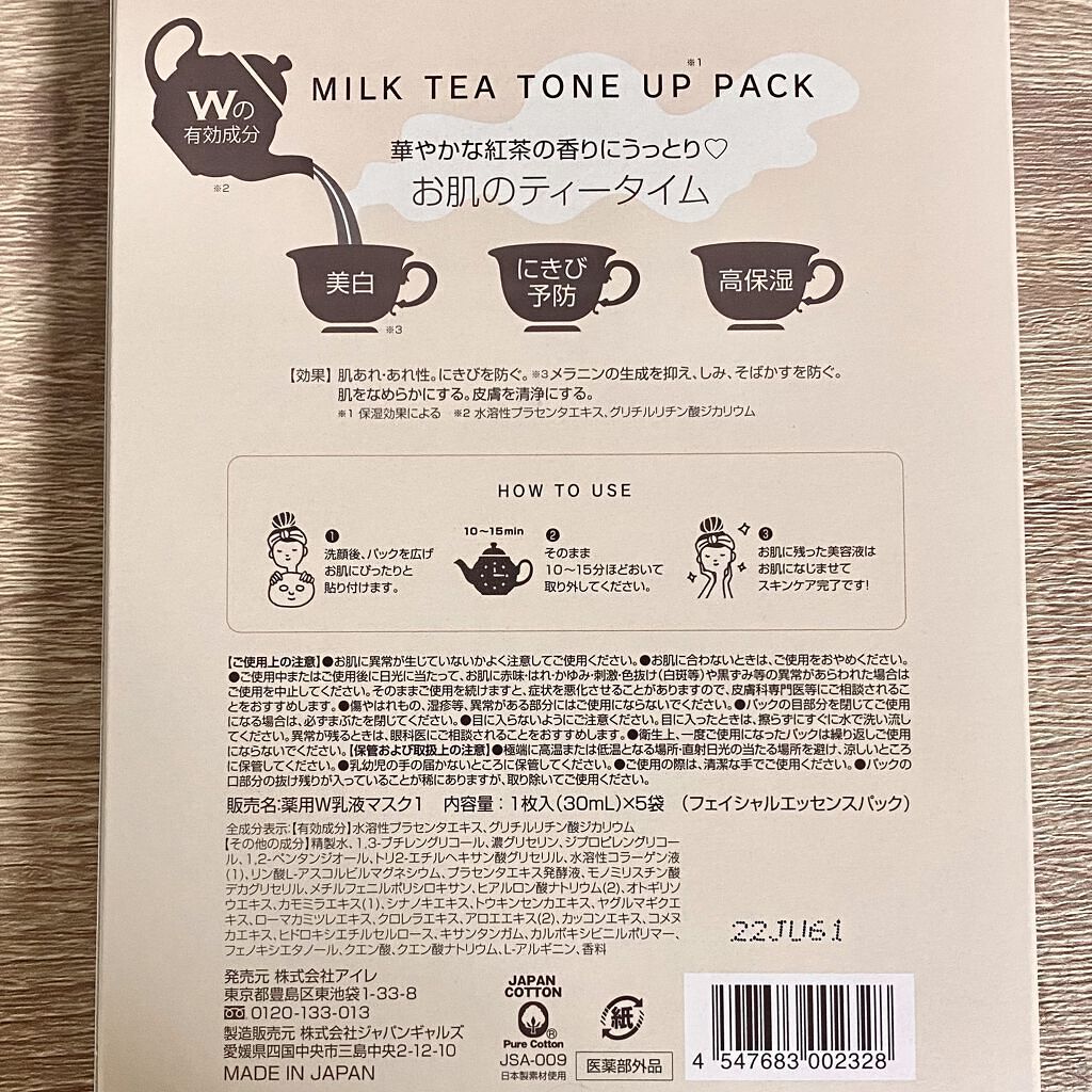 - お肌のティータイム〜お悩みをケアして透明感美肌〜 2つのプラセンタと10種の植物エキスを贅沢に配合した医薬部外品の美容乳液パックです。 うっとり癒される紅茶の香りで、大人女子のお肌とこころを包み込みます。 2つの有効成分『水溶性プラセンタ』と『グリチルリチン酸ジカリウム』を配合。美白*・エイジングケア**・保湿効果に優れ、肌トラブルをケアして健康的なお肌へ。 *メラニンの生成を抑え、シミ・ソバカスを防ぐこと **年齢に応じたお手入れ