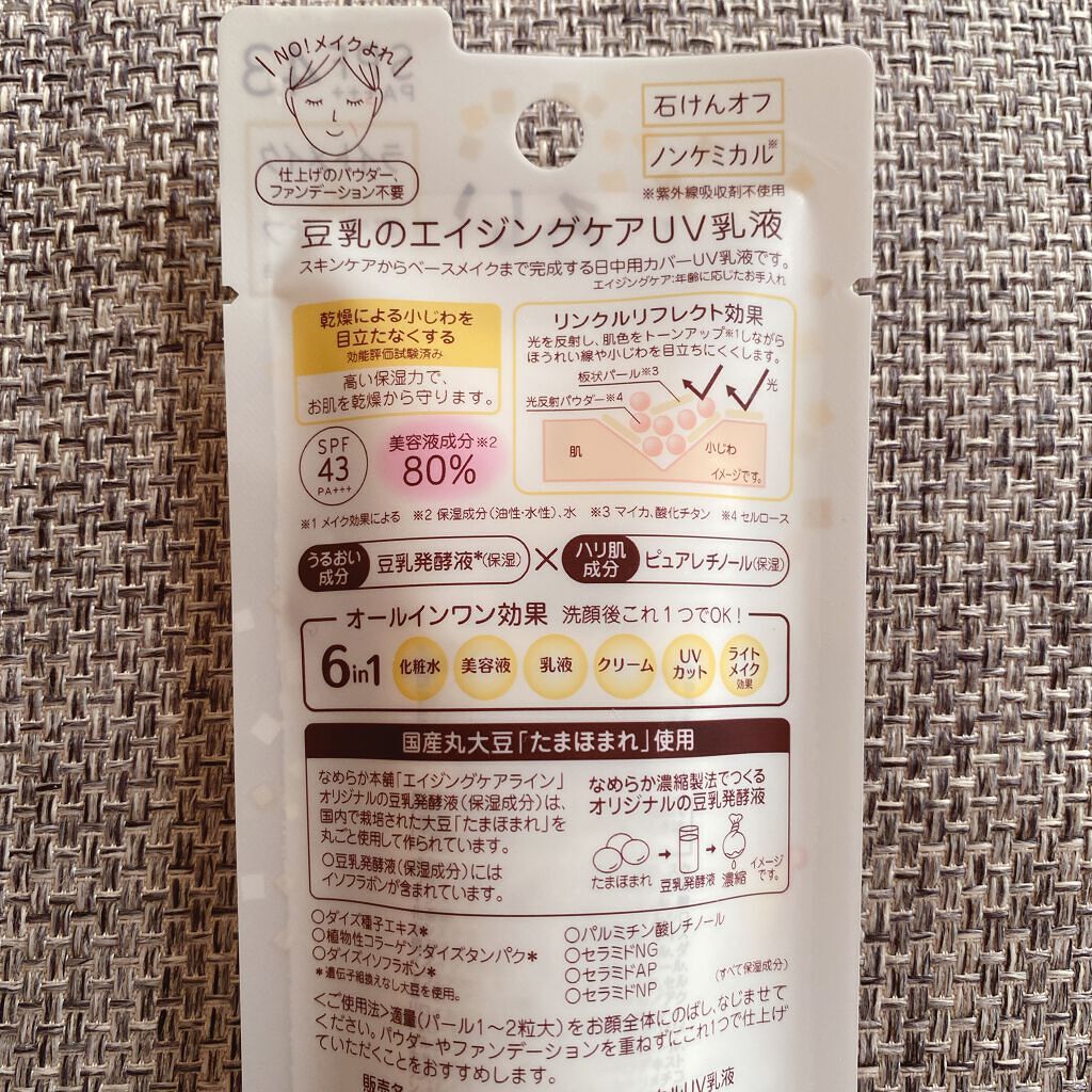 - ほうれい線・小じわのメイクよれが気になる方におすすめの日中用カバーUV 乳液です。リニューアルしたなめらか本舗エイジングケア*1ライン共通の、滋賀県産たまほまれ使用の豆乳発酵液*2とピュアレチノール*2を配合しています。リンクルリフレクト効果で、ほうれい線や小じわを目立たなくし、時間が経ってもメイクよれが気にならない処方を採用しました。お肌にうれしいノンケミカル(紫外線吸収剤不使用)処方で、洗顔後これ 1 つでスキンケアからベースメイクまで完成。 乾燥による小じわを目立たなくします(効能評価試験済み)。 SPF43・PA+++、石けんでオフできます。 *1年齢に応じたお手入れ *2保湿成分