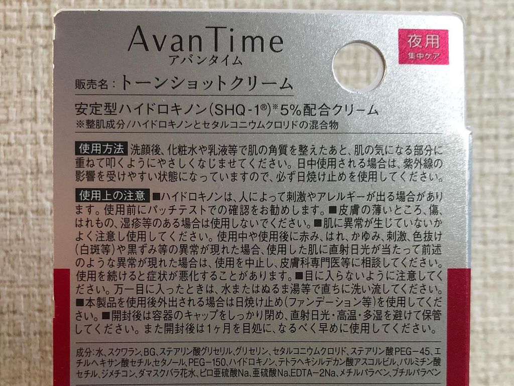 - 「アバンタイム トーンショットクリーム」は安定型ハイドロキノン SHQ-1を5%配合したクリームです。成分が徐々に溶け出しターゲットエリアにアプローチする製品設計であるため、肌にやさしく持続的な作用が期待できます。滑らかで密着しやすいクリームタイプなので、気になる部分を集中的にピンポイントケアすることが可能です。夜のスキンケアの最後に、お肌の気になるポイントにご使用ください。