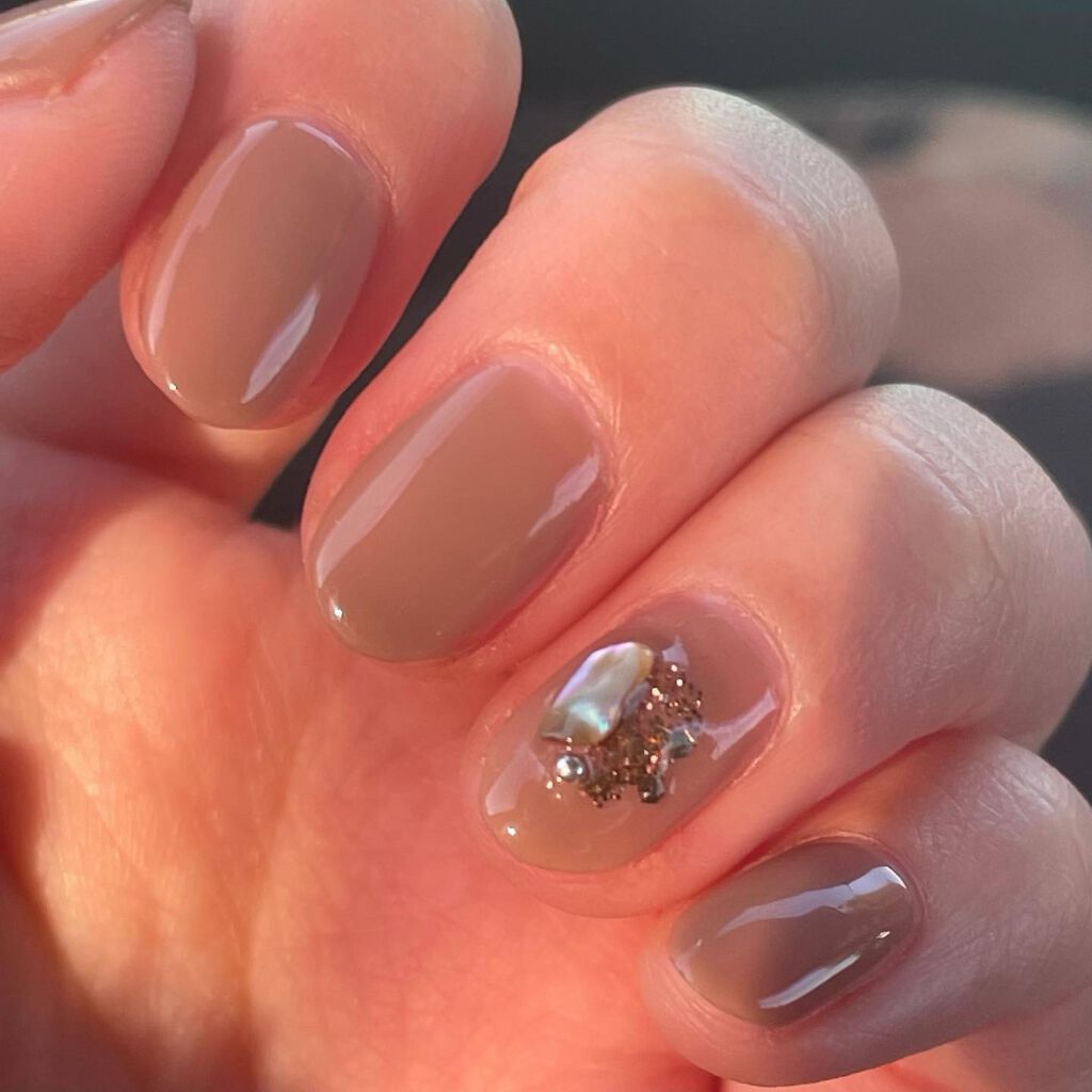 ココアブラウン ファイバーグラスシートで爪の長さだし ちゅるんって感じです ラメのを乗せるといい感じに仕上がりました シンプルな色味だけど、落ち着いてる 上手になればファイバーグラスシート使いこなせる