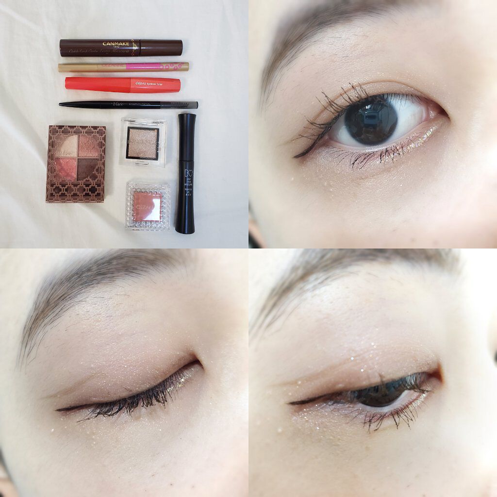 まぶたにのせるアイシャドウは少し控えめに、目頭にハイライトの代わりにシルバー系のラメをのせて存在感~🥳 D-UPのハイパーリフトマスカラの新色ブラウンブラックを❤️🔥 色味が茶色すぎずしっかり目力キープしてくれるけど強すぎなくてちょうどいい、! キャンメイク プティパレットアイズ 02 ボヌールマロン、b idol THE アイパレR 104 ときめきのポッピンラメ