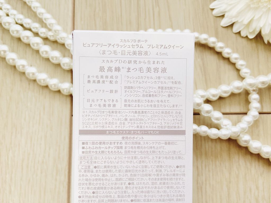 - スカルプDまつ毛美容液シリーズ史上まつ毛美容成分最高濃度※1♪ 「ラッシュDカプセル」3倍※2に加え、独自開発の「プレミアムクイーンカプセル」※3 を配合。 さらに「目元ケアもできるまつ毛美容液」として目元のお肌にうるおいを与えて、乾燥による小じわを目立たなくします※4。 使いやすさ・やさしさにこだわった、ふわふわカールチップ採用で根元からも塗りやすく、敏感な目元にやさしい使い心地。 シリコン、オイル、アルコール(エタノール)、防腐剤(パラベン)、香料、合成着色料、界面活性剤、プロスタグランジン類似物質の8つの成分不使用のピュアフリー設計を実現。まつ毛エクステ、まつ毛パーマにも使え、1日1回のケアでもOKとなっています。 ※1.スカルプDまつ毛美容液シリーズ内最高濃度のこと※2.保湿成分、白金、ビオチノイルトリペプチド-1、パンテノール、グリセリン、ピロリジニルジアミノピリミジンオキシド、シスチン、グルタミン酸、当社SDBピュアフリーアイラッシュセラムSSC2と比較※3.保湿成分、白金、アセチルテトラペプチド-3、アカツメクサ花エキス、ゴボウ根エキス、オオミテングヤシ果実エキス※4.効能評価試験済み