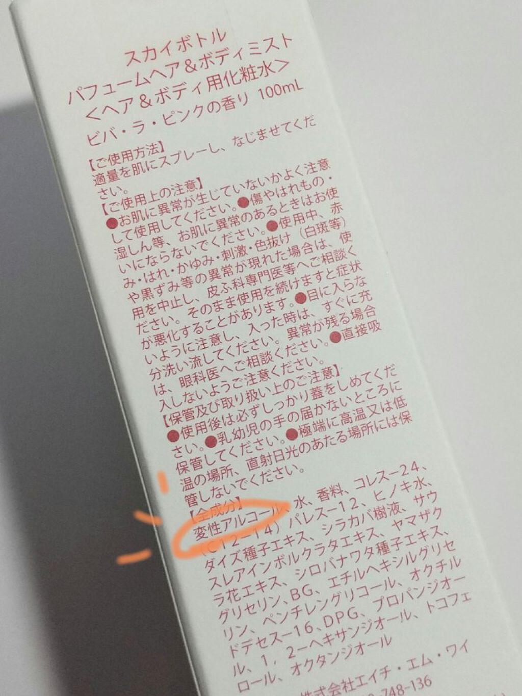 - 変性アルコール、水、香料、コレス-24、(C12-14)パレス-12、ヒノキ水、ダイズ種子エキス、シラカバ樹液、サウスレアインボルクラタエキス、ヤマザクラ花エキス、シロバナワタ種子エキス、グリセリン、BG、エチルヘキシルグリセリン、ペンチレングリコール、オクチルドデセス-16、DPG、プロパンジオール、1,2-ヘキサンジオール、トコフェロール、オクタンジオール