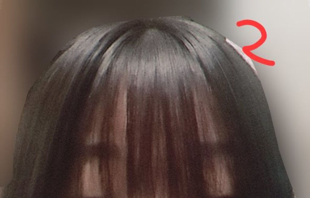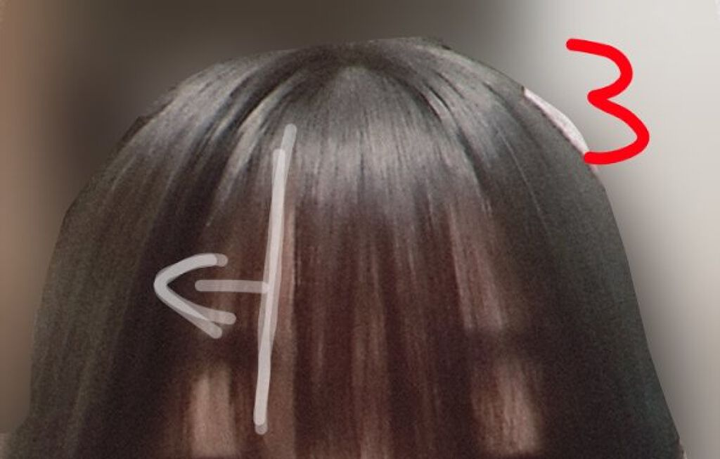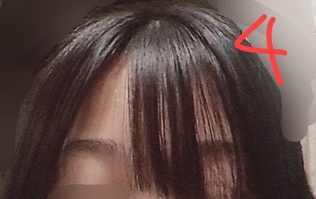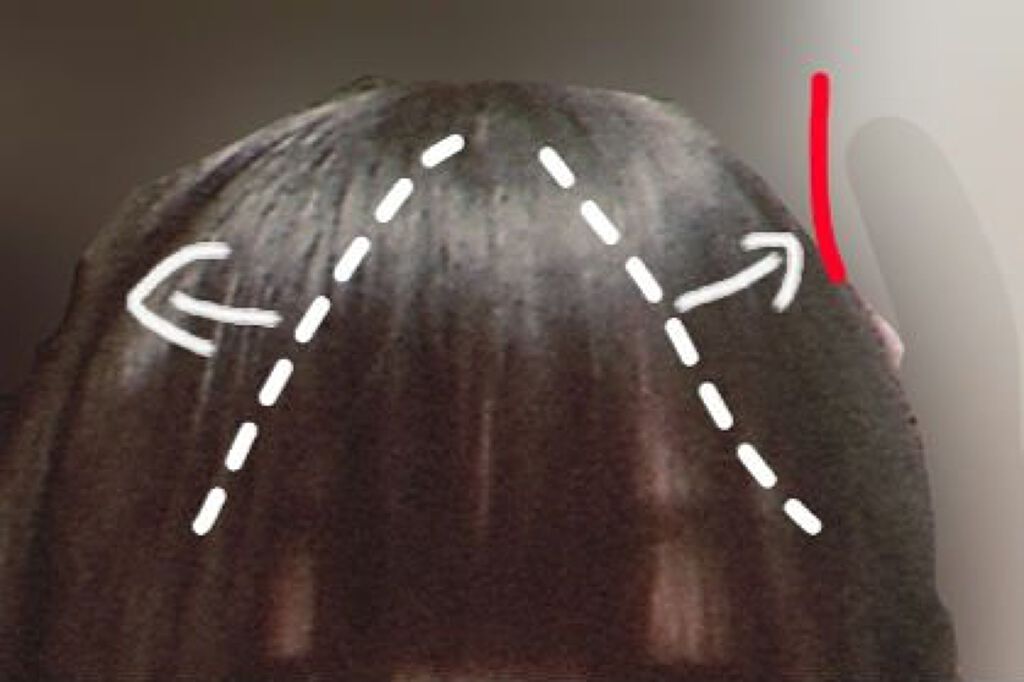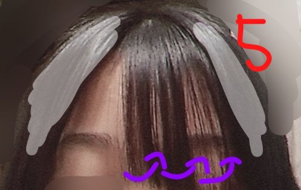 前髪を水で濡らしドライヤーで乾かします 3角になるように適当に分けます 画像5の白いところにワックスを塗ります。いらない前髪を長い髪にくっつけるように塗ります ヘアアイロンで流れるように巻きます