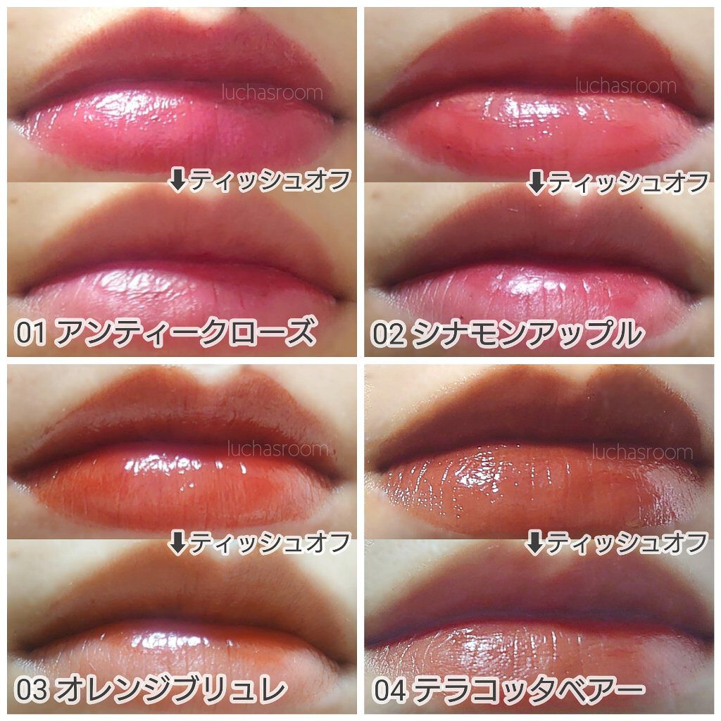 【使った商品】キャンメイクジューシーリップティント【色味】8色全て【色もち】〇【質感】こってり、つやつや【保湿】△【良いところ】カラバリ豊富、発色【イマイチなところ】パッケージでカラー判断が難しいこちら全8色ご紹介です!【01アンティークロー...