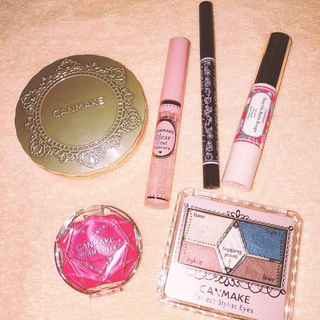 私的CANMAKEお気に入りコスメ!!左上から、マシュマロフィニッシュパウダーMBクリアコートマスカラ01ラスティングリキッドライナー01ステイオンバームルージュ03クリームチーク14パーフェクトスタイリストアイズ15とくに、リップがイイ!少...