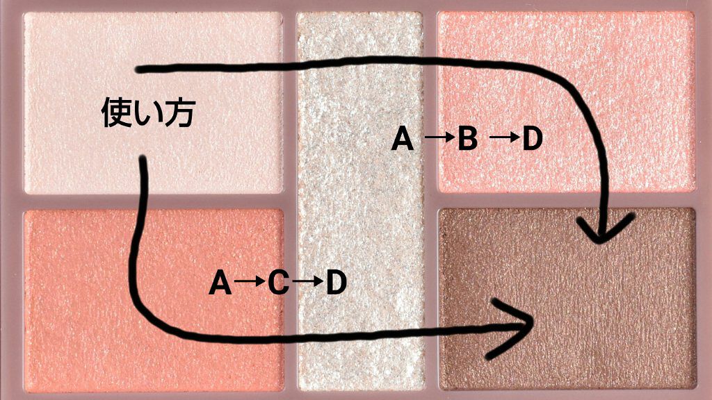 - 1枚のパレットで2つのスタイルが完成! 5色の欲ばりアイシャドウ♥ メインカラーを選んで2つのスタイルが楽しめる! A→B→D でスタイル1 A→C→D でスタイル2 繊細な粉質が、しっとりとまぶたに密着して色落ちを防ぎます。 透明感のあるキラうるトッピングジュエル(繊細ラメ)は、気分によってトッピング!