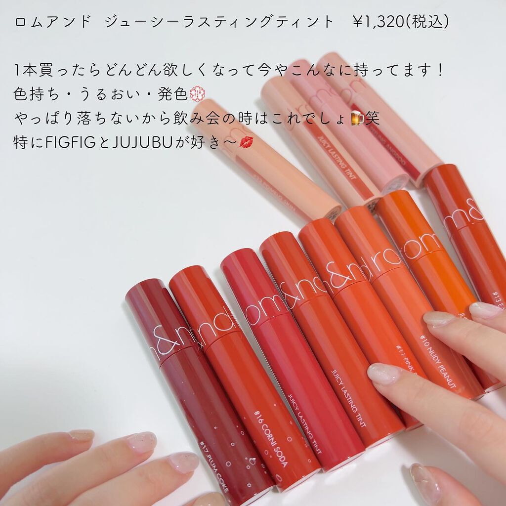 rom&ndロムアンドジューシーラスティングティントフルーツのようなジューシーな発色で人気なこのティント🍎☑︎カラーバリエーションが豊富☑︎色持ちが抜群♡☑︎プチプラ☑︎乾燥しない私が持ってるのはこの3色06FIGFIG07JUJUBE10N...