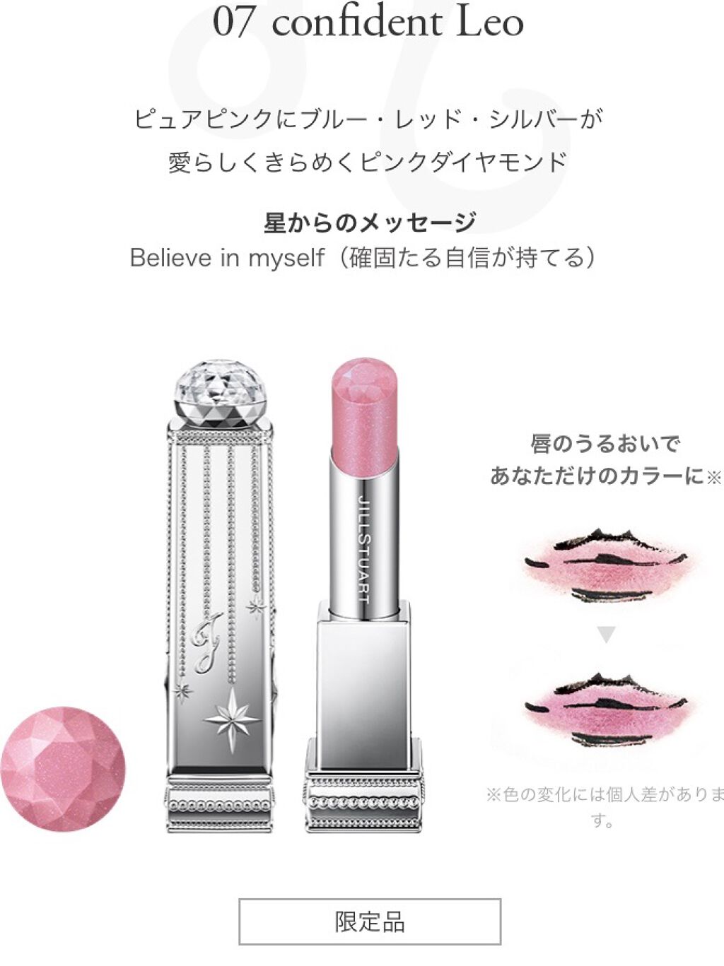 - <01 thoughtful Aquarius<水瓶座>> テトラエチルヘキサン酸ペンタエリスリチル、ダイマージリノール酸(フィトステリル/イソステアリル/セチル/ステアリル/ベヘニル)、トリメリト酸トリトリデシル、リンゴ酸ジイソステアリル、ポリブテン、合成ワックス、トリイソステアリン酸ポリグリセリル-2、ジメチルシリル化シリカ、ポリエチレン、ホウケイ酸(Ca/Al)、アボカド油、アンズ核油、トコフェロール、ラベンダー油、ローズマリー葉エキス、BHT、DPG、PEG-9ポリジメチルシロキシエチルジメチコン、(アクリル酸/アクリル酸アルキル(C10-30))コポリマー、(エチレン/プロピレン)コポリマー、ジイソステアリン酸ポリグリセリル-2、ジメチコン、トリイソステアリン酸イソプロピルチタン、ハイドロゲンジメチコン、パーフルオロヘキシルエチルトリエトキシシラン、ミネラルオイル、メチコン、合成金雲母、酸化スズ、水酸化Al、香料、グンジョウ、酸化チタン、酸化鉄、黄4、青1、赤202、赤223 <03 alluring Aries<牡羊座>> テトラエチルヘキサン酸ペンタエリスリチル、ダイマージリノール酸(フィトステリル/イソステアリル/セチル/ステアリル/ベヘニル)、トリメリト酸トリトリデシル、リンゴ酸ジイソステアリル、ポリブテン、合成ワックス、トリイソステアリン酸ポリグリセリル-2、ジメチルシリル化シリカ、ポリエチレン、アボカド油、アンズ核油、トコフェロール、ラベンダー油、ローズマリー葉エキス、BHT、DPG、PEG-9ポリジメチルシロキシエチルジメチコン、(アクリル酸/アクリル酸アルキル(C10-30))コポリマー、(エチレン/プロピレン)コポリマー、シリカ、ジイソステアリン酸ポリグリセリル-2、ジメチコン、トリイソステアリン酸イソプロピルチタン、ハイドロゲンジメチコン、ミネラルオイル、メチコン、合成金雲母、酸化スズ、水酸化Al、香料、マイカ、酸化チタン、酸化鉄、黄4、黄5、赤104(1)、赤202、赤218 <05 promised Gemini<双子座>> テトラエチルヘキサン酸ペンタエリスリチル、ダイマージリノール酸(フィトステリル/イソステアリル/セチル/ステアリル/ベヘニル)、トリメリト酸トリトリデシル、リンゴ酸ジイソステアリル、ポリブテン、合成ワックス、トリイソステアリン酸ポリグリセリル-2、ジメチルシリル化シリカ、ポリエチレン、アボカド油、アンズ核油、トコフェロール、ラベンダー油、ローズマリー葉エキス、BHT、DPG、PEG-9ポリジメチルシロキシエチルジメチコン、(アクリル酸/アクリル酸アルキル(C10-30))コポリマー、(エチレン/プロピレン)コポリマー、ジイソステアリン酸ポリグリセリル-2、ジメチコン、トリイソステアリン酸イソプロピルチタン、ハイドロゲンジメチコン、パーフルオロヘキシルエチルトリエトキシシラン、ホウケイ酸(Ca/Al)、ミネラルオイル、メチコン、合成金雲母、酸化スズ、水酸化Al、香料、酸化チタン、酸化鉄、黄4、赤202、赤223 <12 completed Capricorn<山羊座>> テトラエチルヘキサン酸ペンタエリスリチル、ダイマージリノール酸(フィトステリル/イソステアリル/セチル/ステアリル/ベヘニル)、トリメリト酸トリトリデシル、リンゴ酸ジイソステアリル、ポリブテン、合成ワックス、トリイソステアリン酸ポリグリセリル-2、ジメチルシリル化シリカ、ポリエチレン、ホウケイ酸(Ca/Al)、アボカド油、アンズ核油、トコフェロール、ラベンダー油、ローズマリー葉エキス、BHT、DPG、PEG-9ポリジメチルシロキシエチルジメチコン、(アクリル酸/アクリル酸アルキル(C10-30))コポリマー、(エチレン/プロピレン)コポリマー、シリカ、ジイソステアリン酸ポリグリセリル-2、ジメチコン、トリイソステアリン酸イソプロピルチタン、ハイドロゲンジメチコン、パーフルオロヘキシルエチルトリエトキシシラン、ミネラルオイル、メチコン、合成金雲母、酸化スズ、水酸化Al、香料、グンジョウ、酸化チタン、酸化鉄、黄4、赤202、赤218 <10 harmonious Scorpio> テトラエチルヘキサン酸ペンタエリスリチル、ダイマージリノール酸(フィトステリル/イソステアリル/セチル/ステアリル/ベヘニル)、トリメリト酸トリトリデシル、リンゴ酸ジイソステアリル、合成ワックス、ポリブテン、トリイソステアリン酸ポリグリセリル-2、ジメチルシリル化シリカ、ポリエチレン、アボカド油、アンズ核油、トコフェロール、ラベンダー油、ローズマリー葉エキス、BHT、DPG、PEG-9ポリジメチルシロキシエチルジメチコン、(アクリル酸/アクリル酸アルキル(C10-30))コポリマー、ジイソステアリン酸ポリグリセリル-2、ジメチコン、トリイソステアリン酸イソプロピルチタン、ハイドロゲンジメチコン、ミネラルオイル、メチコン、合成金雲母、酸化スズ、水酸化Al、香料、酸化チタン、酸化鉄、黄4、赤202、赤223 <08 enthusiastic Virgo<乙女座>> テトラエチルヘキサン酸ペンタエリスリチル、ダイマージリノール酸(フィトステリル/イソステアリル/セチル/ステアリル/ベヘニル)、トリメリト酸トリトリデシル、リンゴ酸ジイソステアリル、ポリブテン、合成ワックス