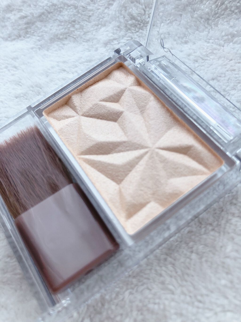 色の組み合わせが最高♡ どんな時にも馴染む。 薄めな仕上がり。 ピーチベージュは右上が、ほぼ色味は付かない? キラキラ感は綺麗だからハイライトみたいに使ってる。 チークはしっとり質感だからか、ブラシへの粉含みが大人しめ? 薄い発色だし、何度も往復するからベースが剥がれがち。 ベージュトーンアイシャドウは使いやすくて、他の色も愛用している♡ ピーチベージュは色味が少ないからグラデ作りより、単色とラメでの仕上がりになりそう。 チークブラッシュは01も持っていて、そちらは発色がいい! けど色味が合わなかったので、03を買ったけど、うーんという感じ。 私には粉質がサラサラしてるほうが使いやすいのかも。 色は可愛い♡