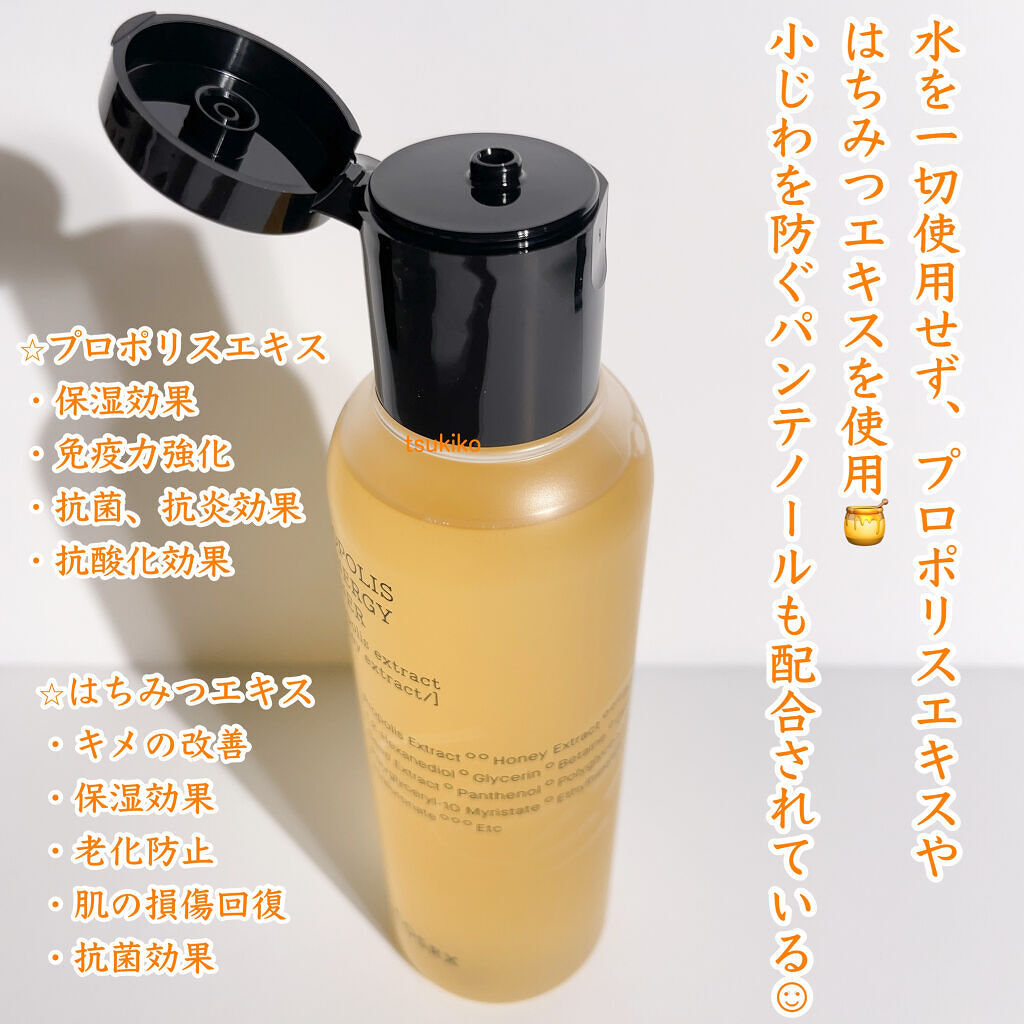 - 1)肌を引き締めながらなめらかな肌に整える、しっとりしてべたつかないトナー。 2)主な成分: プロポリスエキス72.6%、蜂蜜エキス10%。肌にハリとうるおいを与え、乾燥を防ぎます。 すべてのスキンタイプにおすすめでございます。Full Fit Propolis Light Ample とともに使用することをお勧めします。