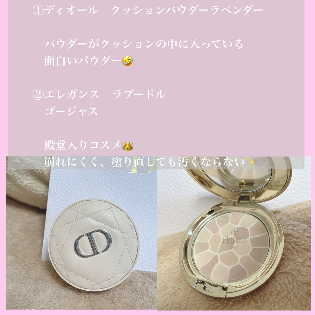 この下地はプチプラですが 皮脂崩れを予防してくれます! Dior ディオールスキン フォーエヴァー フルイド グロウ これはサンプルで貰って、 実際につかった時に ツヤすごい✨ 崩れない✨ と一目惚れして購入しました! ディオールスキン フォーエヴァー クッション パウダー ラベンダー パケ買いです笑 持っているだけでテンションがとても上がります! Elégance ラ プードル オートニュアンス V ゴージャス 殿堂入りコスメですね! ツヤが出るけど、ナチュラルなもの!