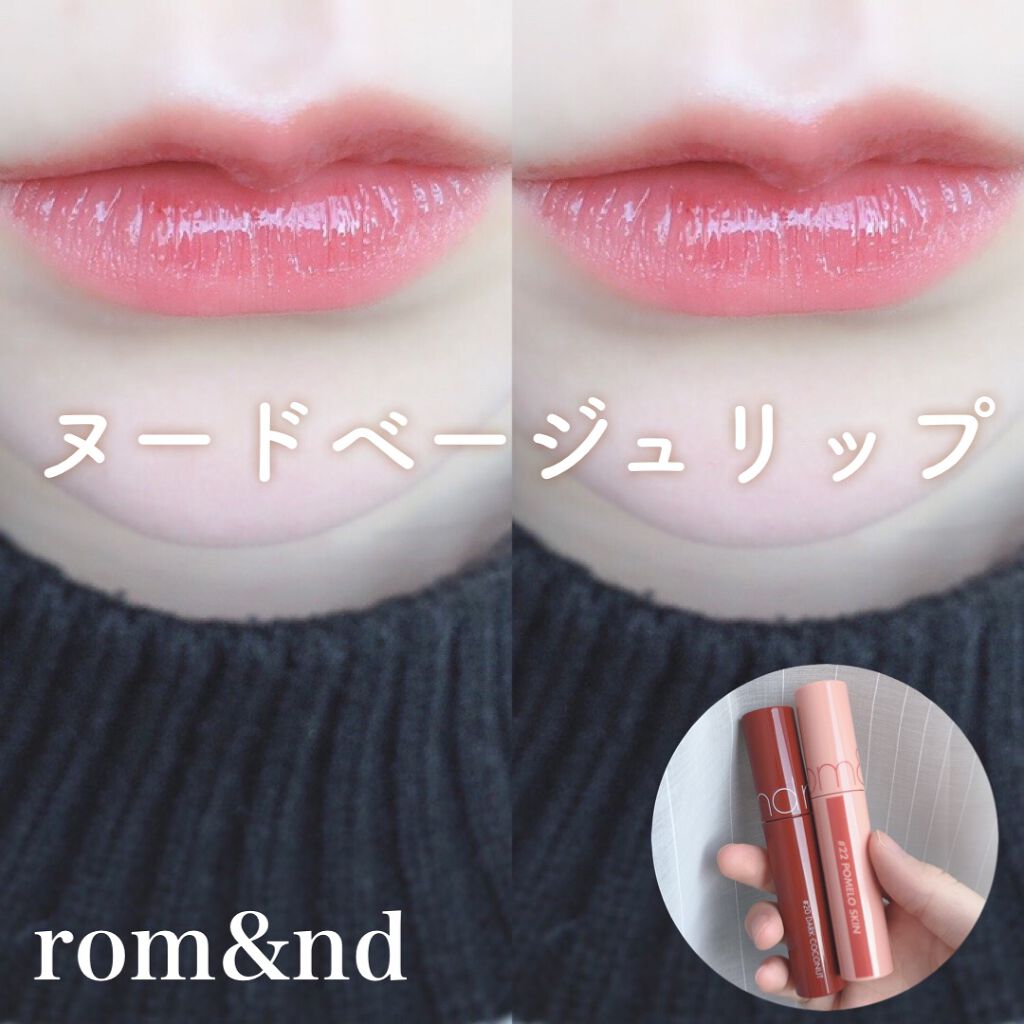 ロムアンドのリップはカラバリ豊富なこと♡ 必ず自分にあったカラーを見つけられるよ😽🫶🏻 ポメロスキンは、ヌーディベージュなカラーで、イエベメイクする時のベースリップとして使ってるよ☆*。 塗った数分後には、光沢感が出てきてあるぷるんぷるんな唇を作れるからお気に入り♡