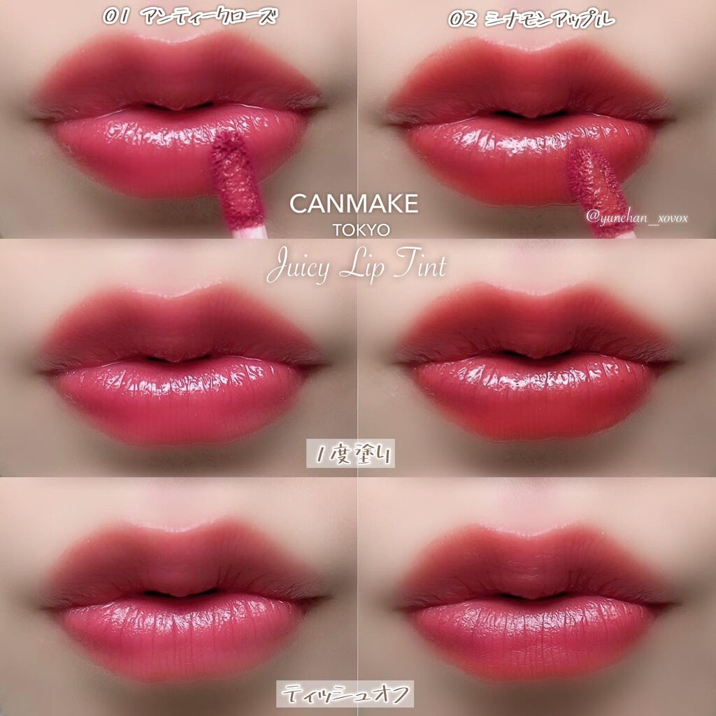 【使った商品】キャンメイクジューシーリップティント【色味】8色全て【色もち】〇【質感】こってり、つやつや【保湿】△【良いところ】カラバリ豊富、発色【イマイチなところ】パッケージでカラー判断が難しいこちら全8色ご紹介です!【01アンティークロー...