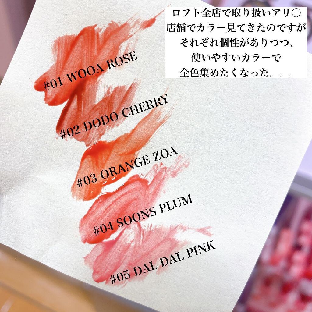 - 01 WOOA ROSE 精製水,ビス-ベヘニル,アイソステアリル,フィトスチェリル,ダイマーダイリノレール,ダイマーダイリノライト,ハイドロジェネチドポリアイソブテン,ダイアイソステアリルマレート,ビス-ジグリセリルフォリアシルアジフェート-2,グリセリン,セチルピイジ/ピフィジ-10 / 1 ダイメチコン,ポリソルベート60,ソルビタンアイソステアレート,ペンチレングライコール,シアバダー,ダイヤモンド粉,ヒアルロン酸ナトリウム,ザクロエキス,セテアレス-20,ヒドロキシエチルアクリレート/ソジウムアクリロイルジメチル/タウレートコポリマー,スクワラン(植物性),メントール,ポリグリセリル-2トライアイスステアレート,メンチルラクテート,エチルヘキシルグリセリン,ポリグリセリル-2ダイヤソステアレート,トライソジウムエチルレンダイアミンダイソキシネート,ブチレングリコール,フェノキシエタノール,チタンデオキサイド (CI 77891),赤色酸化鉄 (CI 77491),黄色酸化鉄 (CI 77492),赤色202号 (CI 15850),黄色5号 (CI 15985),赤色227号 (CI 17200),赤色酸化鉄 (CI 77499) 02 DODO CHERRY 精製水,ビス-ベヘニル/アイソステアリル/フィトスチェリル,ダイマーダイリノレール,ダイマーダイリノライト,ハイドロジェネチドポリアイソブテン,ダイアイソステアリルマレート,ビス-ジグリセリルフォリアシルアジフェート-2,グリセリン,セチルピイジ/ピフィジ-10 / 1 ダイメチコン,ポリソルベート60,ソルビタンアイソステアレート,ペンチレングライコール,シアバダー,ダイヤモンド粉,ヒアルロン酸ナトリウム,ザロエクキス,セテアレス-20,ヒドロキシエチルアクリレート/ソジウムアクリロイルジメチル/タウレートコポリマー,スクワラン(植物性),メントール,メンチルラクテート,ポリグリセリル-2トライアイスステアレート,エチルヘキシルグリセリン,ポリグリセリル-2ダイヤソステアレート,トライソジウムエチルレンダイアミンダイソキシネート,ブチレングリコール,フェノキシエタノール,チタンデオキサイド (CI 77891),赤色酸化鉄 (CI 77491),黄色5号 (CI 15985),赤色202号 (CI 15850),赤色227号 (CI 17200),黒色酸化鉄 (CI 77499),赤色227号 (CI 17200),青色1号 (CI 42090) 03 ORANGE ZOA 精製水,ビス-ベヘニル/アイソステアリル/フィトスチェリルダイマーダイリノレールダイマーダイリノライト,ハイドロジェネチドポリアイソブテン,ダイアイソステアリルマレート,ビス-ジグリセリルフォリアシルアジフェート-2,グリセリン,セチルピイジ/ピフィジ-10 / 1 ダイメチコン,ポリソルベート60,ソルビタンアイソステアレート,ペンチレングライコール,シアバダー,ダイヤモンド粉,ヒアルロン酸ナトリウム,ジャクロエクキス,セテアレス-20,ヒドロキシエチルアクリレート/ソジウムアクリロイルジメチル/タウレートコポリマー,スクワラン(植物性),メントール,メンチルラクテート,エチルヘキシルグリセリン,ポリグリセリル-2ダイヤソステアレート,トライソジウムエチルレンダイアミンダイソキシネート,ブチレングリコール,フェノキシエタノール,チタンデオキサイド (CI 77891),黄色5号 (CI 15985),赤色202号 (CI 15850),赤色227号 (CI 17200),赤色104号(1) (CI 45410),青色1号 (CI 42090) 04 SOONS PLUM 精製水,ビス-ベヘニル/アイソステアリル/フィトスチェリルダイマーダイリノレールダイマーダイリノライト,ハイドロジェネチドポリアイソブテン,ダイアイソステアリルマレート,ビス-ジグリセリルフォリアシルアジフェート-2,グリセリン,セチルピイジ/ピフィジ-10 / 1 ダイメチコン,ポリソルベート60,ソルビタンアイソステアレート,ペンチレングライコール,シアバダー,ダイヤモンド粉,ヒアルロン酸ナトリウム,ジャクロエクキス,セテアレス-20,ヒドロキシエチルアクリレート/ソジウムアクリロイルジメチル/タウレートコポリマー,スクワラン(植物性),メントール,メンチルラクテート,ポリグリセリル-2ダイヤソステアレート,エチルヘキシルグリセリン,ポリグリセリル-2トライアイスステアレート,トライソジウムエチルレンダイアミンダイソキシネート,ブチレングリコール,フェノキシエタノール,チタンデオキサイド (CI 77891),赤色202号 (CI 15850),黄色5号 (CI 15985),黄色酸化鉄 (CI 77492),赤色104号(1) (CI 45410),青色1号 (CI 42090) 05DALDAL PINK 精製水,ビス-ベヘニル/アイソステアリル/フィトスチェリルダイマーダイリノレールダイマーダイリノライト,ハイドロジェネチドポリアイソブテン,ダイアイソステアリルマレート,ビス-ジグリセリルフォリアシルアジフェート-2,グリセリン,セチルピイジ/ピフィジ-10 / 1 ダイメチコン,ポリソルベート60,ソルビタンアイソステアレート,ペンチレングライコール,シアバダー,ダイヤモンド粉,ヒアルロン酸ナトリウム,ザロエクキス,セテアレス-20,ヒドロキシエチルアクリレート/ソジウムアクリロイルジメチル/タウレートコポリマー,スクワラン(植物性),メントール,メンチルラクテート,エチルヘキシルグリセリン,ポリグリセリル-2トライアイスステアレート,ポリグリセリル-2ダイヤソステアレート,トライソジウムエチルレンダイアミンダイソキシネ