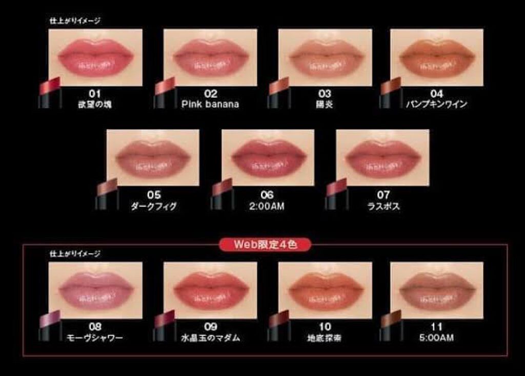 - <01 欲望の塊> テトライソステアリン酸ジペンタエリスリチル、トリ(カプリル酸/カプリン酸)グリセリル、オクチルドデカノール、ラウロイルグルタミン酸ジ(フィトステリル/オクチルドデシル)、ビスアルキル(C16-18)グリセリルウンデシルジメチコン、イソノナン酸イソトリデシル、水添ポリイソブテン、ラウロイルグルタミン酸ジ(オクチルドデシル/フィトステリル/ベヘニル)、パラフィン、合成ワックス、ダイマージリノール酸(フィトステリル/イソステアリル/セチル/ステアリル/ベヘニル)、マイクロクリスタリンワックス、水添マイクロクリスタリンワックス、ヒドロキシステアリン酸エチルヘキシル、トコフェロール、ホホバ種子油、オリーブ果実油、アーモンド油、(エチレン/プロピレン)コポリマー、ポリエチレン、ジメチコン、(+/-)(チタン/酸化チタン)焼結物、マイカ、ラウロイルアスパラギン酸Na、ラウロイルリシン、塩化亜鉛、酸化チタン、酸化鉄、水酸化Al、硫酸Ba、トリイソステアリン酸イソプロピルチタン、酸化スズ、ホウケイ酸(Ca/Al)、合成フルオロフロゴパイト、黄4、黄5、赤104(1)、赤201、赤202 <02 ピンクバナナ> テトライソステアリン酸ジペンタエリスリチル、トリ(カプリル酸/カプリン酸)グリセリル、オクチルドデカノール、ラウロイルグルタミン酸ジ(フィトステリル/オクチルドデシル)、ビスアルキル(C16-18)グリセリルウンデシルジメチコン、イソノナン酸イソトリデシル、水添ポリイソブテン、ラウロイルグルタミン酸ジ(オクチルドデシル/フィトステリル/ベヘニル)、パラフィン、合成ワックス、ダイマージリノール酸(フィトステリル/イソステアリル/セチル/ステアリル/ベヘニル)、マイクロクリスタリンワックス、水添マイクロクリスタリンワックス、ヒドロキシステアリン酸エチルヘキシル、トコフェロール、ホホバ種子油、オリーブ果実油、アーモンド油、(エチレン/プロピレン)コポリマー、ポリエチレン、ジメチコン、(+/-)(チタン/酸化チタン)焼結物、マイカ、ラウロイルアスパラギン酸Na、ラウロイルリシン、塩化亜鉛、酸化チタン、酸化鉄、水酸化Al、硫酸Ba、トリイソステアリン酸イソプロピルチタン、酸化スズ、ホウケイ酸(Ca/Al)、合成フルオロフロゴパイト、黄4、黄5、赤104(1)、赤201、赤202 <03 陽炎> テトライソステアリン酸ジペンタエリスリチル、トリ(カプリル酸/カプリン酸)グリセリル、オクチルドデカノール、ラウロイルグルタミン酸ジ(フィトステリル/オクチルドデシル)、ビスアルキル(C16-18)グリセリルウンデシルジメチコン、イソノナン酸イソトリデシル、水添ポリイソブテン、ラウロイルグルタミン酸ジ(オクチルドデシル/フィトステリル/ベヘニル)、パラフィン、合成ワックス、ダイマージリノール酸(フィトステリル/イソステアリル/セチル/ステアリル/ベヘニル)、マイクロクリスタリンワックス、水添マイクロクリスタリンワックス、ヒドロキシステアリン酸エチルヘキシル、トコフェロール、ホホバ種子油、オリーブ果実油、アーモンド油、(エチレン/プロピレン)コポリマー、ポリエチレン、ジメチコン、(+/-)(チタン/酸化チタン)焼結物、マイカ、ラウロイルアスパラギン酸Na、ラウロイルリシン、塩化亜鉛、酸化チタン、酸化鉄、水酸化Al、硫酸Ba、トリイソステアリン酸イソプロピルチタン、酸化スズ、ホウケイ酸(Ca/Al)、合成フルオロフロゴパイト、黄4、黄5、赤104(1)、赤201、赤202 <04 パンプキンワイン> テトライソステアリン酸ジペンタエリスリチル、トリ(カプリル酸/カプリン酸)グリセリル、オクチルドデカノール、ラウロイルグルタミン酸ジ(フィトステリル/オクチルドデシル)、ビスアルキル(C16-18)グリセリルウンデシルジメチコン、イソノナン酸イソトリデシル、水添ポリイソブテン、ラウロイルグルタミン酸ジ(オクチルドデシル/フィトステリル/ベヘニル)、パラフィン、合成ワックス、ダイマージリノール酸(フィトステリル/イソステアリル/セチル/ステアリル/ベヘニル)、マイクロクリスタリンワックス、水添マイクロクリスタリンワックス、ヒドロキシステアリン酸エチルヘキシル、トコフェロール、ホホバ種子油、オリーブ果実油、アーモンド油、(エチレン/プロピレン)コポリマー、ポリエチレン、ジメチコン、(+/-)(チタン/酸化チタン)焼結物、マイカ、ラウロイルアスパラギン酸Na、ラウロイルリシン、塩化亜鉛、酸化チタン、酸化鉄、水酸化Al、硫酸Ba、トリイソステアリン酸イソプロピルチタン、酸化スズ、ホウケイ酸(Ca/Al)、合成フルオロフロゴパイト、黄4、黄5、赤104(1)、赤201、赤202 <05 ダークフィグ> テトライソステアリン酸ジペンタエリスリチル、トリ(カプリル酸/カプリン酸)グリセリル、オクチルドデカノール、ラウロイルグルタミン酸ジ(フィトステリル/オクチルドデシル)、ビスアルキル(C16-18)グリセリルウンデシルジメチコン、イソノナン酸イソトリデシル、水添ポリイソブテン、ラウロイルグルタミン酸ジ(オクチルドデシル/フィトステリル/ベヘニル)、
