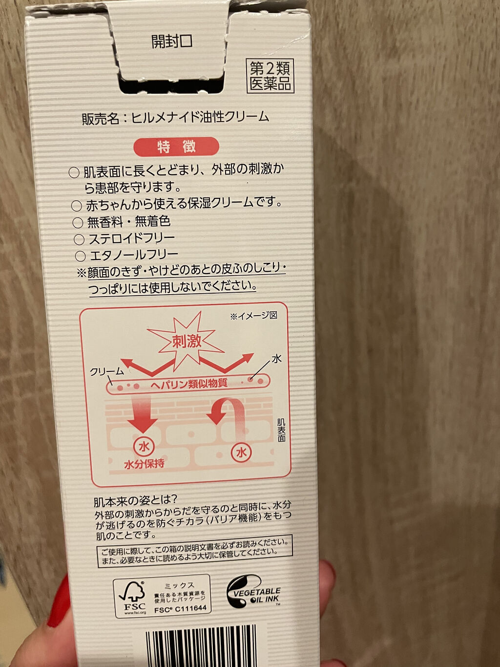 - 「ヒルメナイド油性クリーム」はヘパリン類似物質を含有する高い保湿力の油性クリームです。またヘパリン類似物質のみの単一処方製剤であり、無香料・無着色、ステロイドフリー、エタノールフリーのため、赤ちゃんもお使いいただけます。