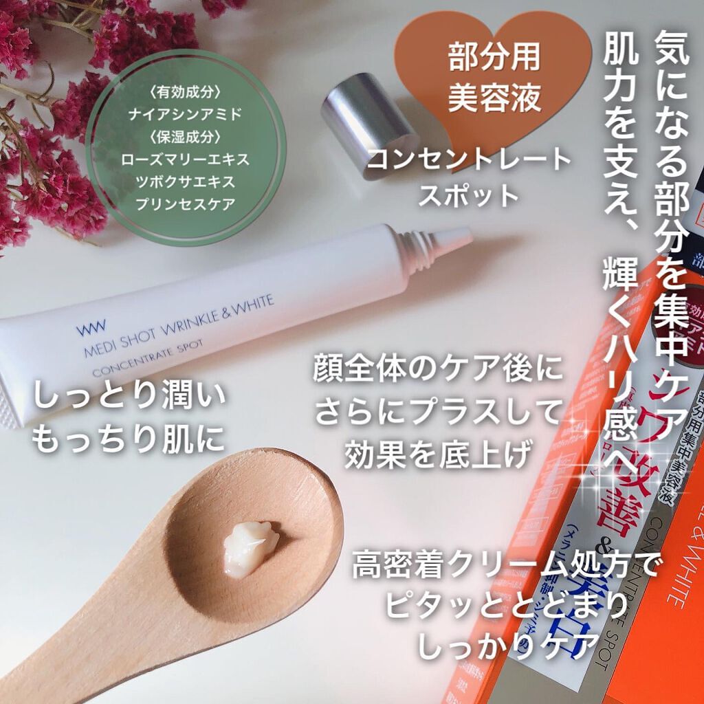 薬用メディショット コンセートレートスポット 部分用クリーム状集中美容液 有効成分ナイアシンアミド配合 目元や口元の悩みに。 こっくりめのクリームだけど伸びやすいです。 クリームなので、少しベタつきがあります。アロマティックフルールの香り 3つともこっくりめのテクスチャーで、しっとりした使い心地なので、重めの使い心地が好きな方におすすめ!