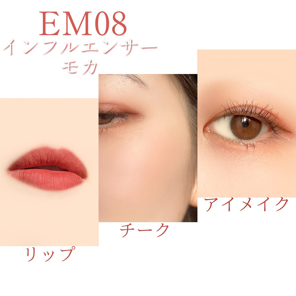 人気カラーEM05 美人シナモンとやや色味の深いイエローベースのEM08インフルエンサーモカ 肌につけるとパウダー化する独自製法により、チークやアイメイクにも◎ 指の関節くらいのミニサイズでとっても可愛い〜 持ち歩きに嬉しいサイズ感だよ!