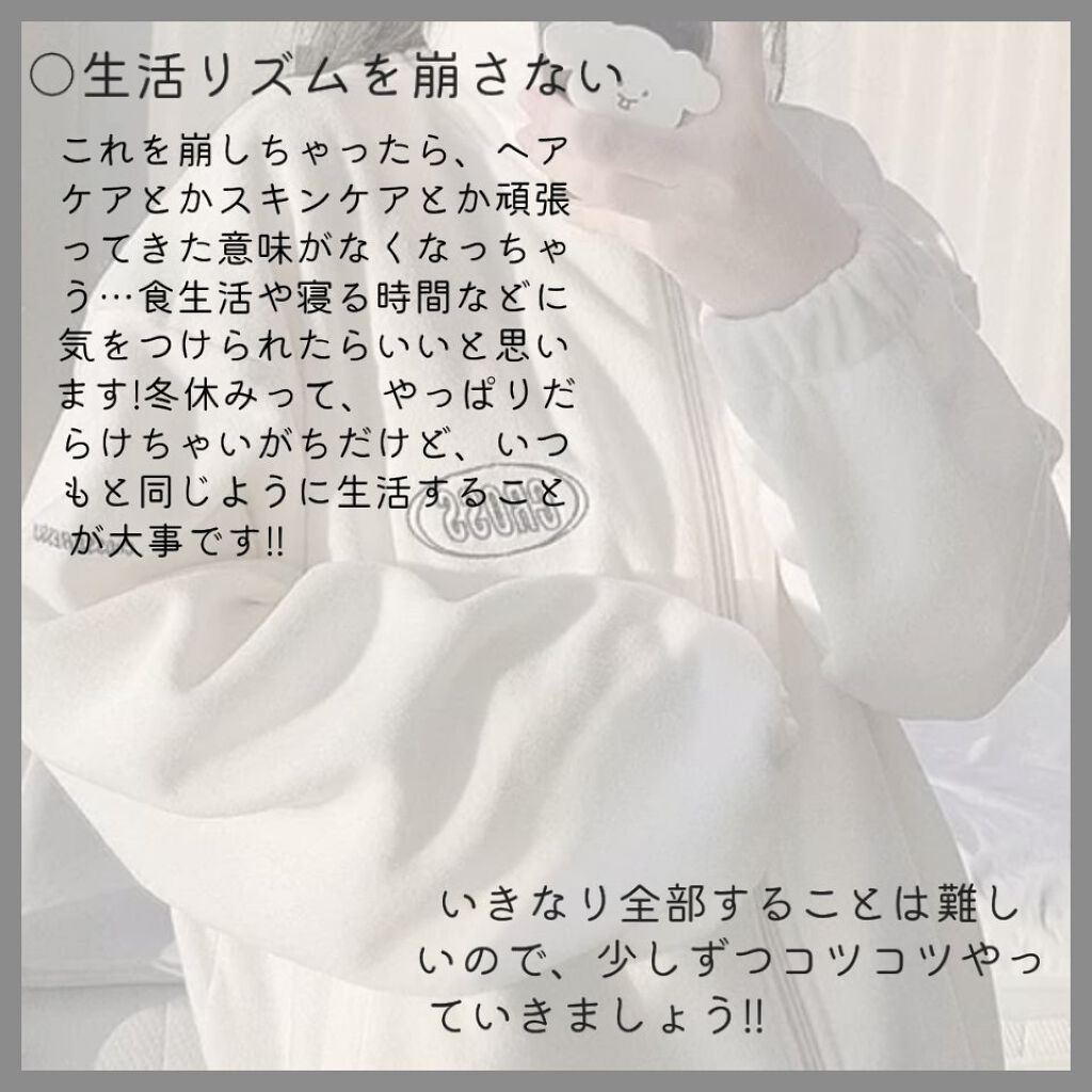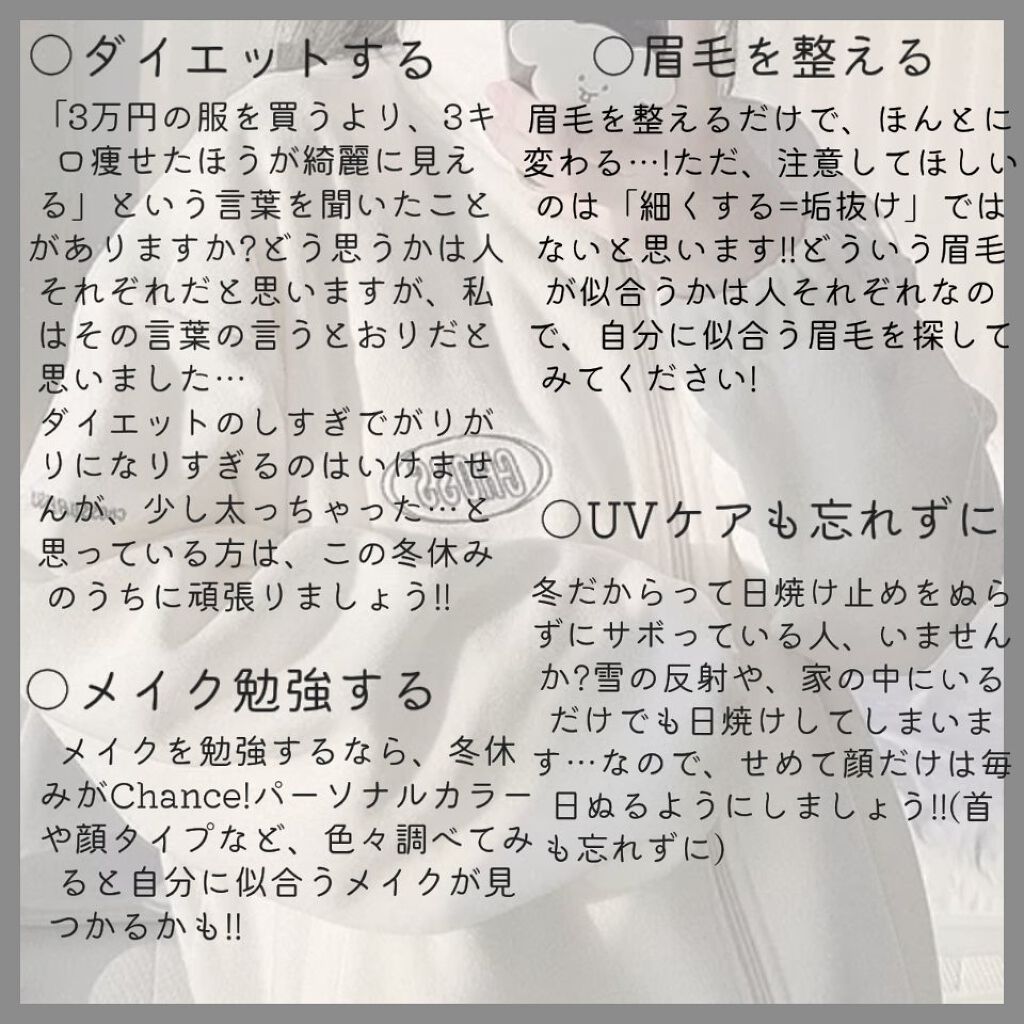 ヘアケアを徹底するだけで印象は変わります!✨ 肌が綺麗だと透明感UP↗ 冬休みのうちに頑張ってニキビなしのすべすべな肌を 目指しちゃいましょう!!✨🔥 冬はやっぱり乾燥しちゃいますよねぇ でも、かさかさなお手手はNG🙅 しっかりハンドクリームをぬってケアしましょう! あとは、爪も保湿して綺麗にしましょう!! 「3万円の服を買うより3キロ痩せたほうが綺麗に見える」 という言葉を知ってますか? どう思うかは人それぞれだと思います…が 私はその言葉の言うとおりだと思います 眉毛を整えるだけで印象は変わります! ボサボサ眉毛は△ しっかりYouTubeとかで動画を見ながら 整えると良いとおもいます! メイク勉強するなら冬休みがChance! 自分にあったメイクを調べてみてください〜 冬だからってUVケアを怠ってはだめです✗ 冬も紫外線を浴びているので、日焼けする可能性は十分に あります😭 しっかりUVケアもしていきましょう! これを崩したら色々なケアが全部無駄に… 寝る時間とか、食べるものとかに気をつけましょう!