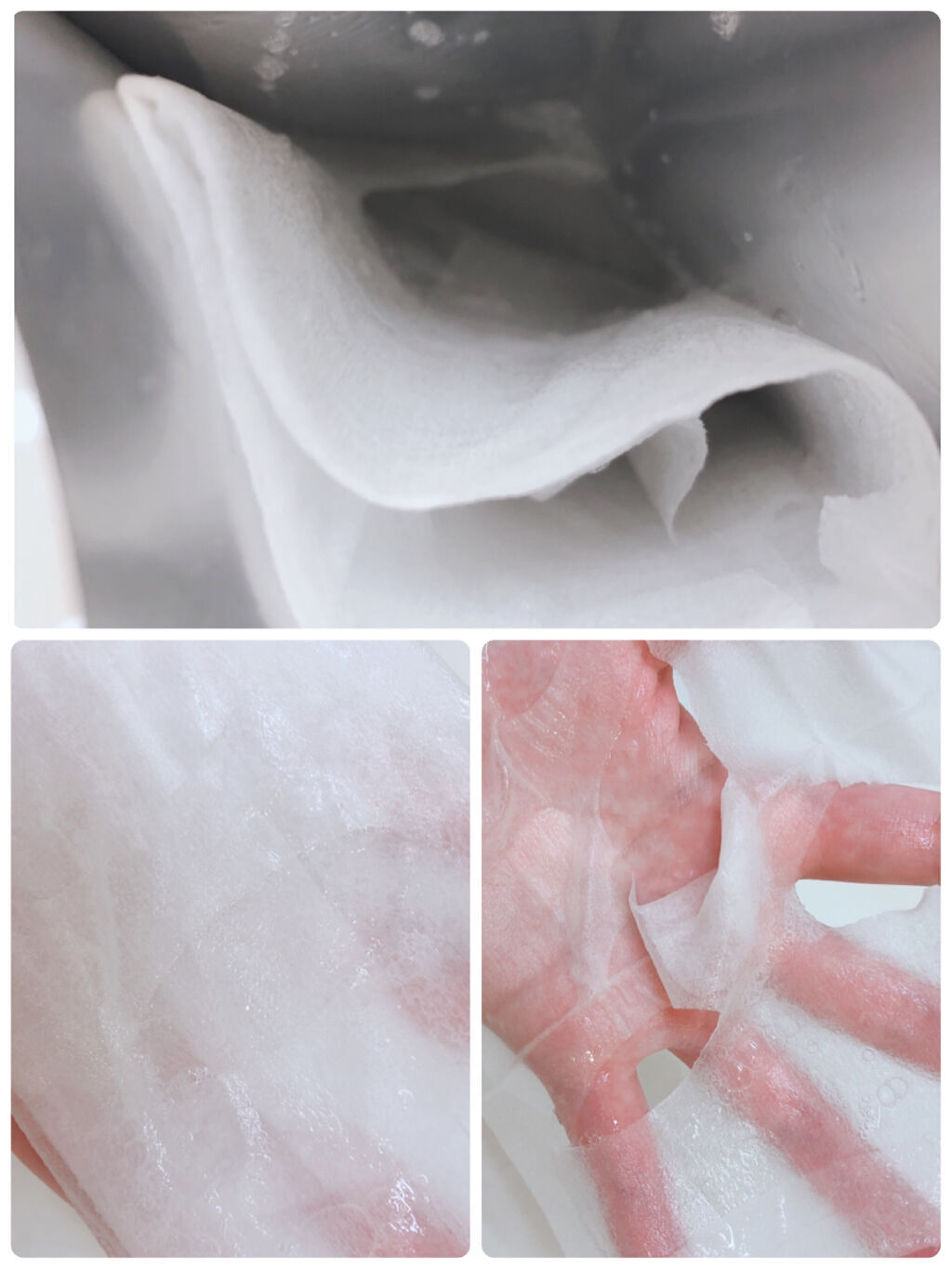 - たっぷり染み込んだ弱酸性の美容液を、コットンで作られた柔らかいシートで肌にピタっと密着。 しっとり保湿、肌にうるおいを与えます。