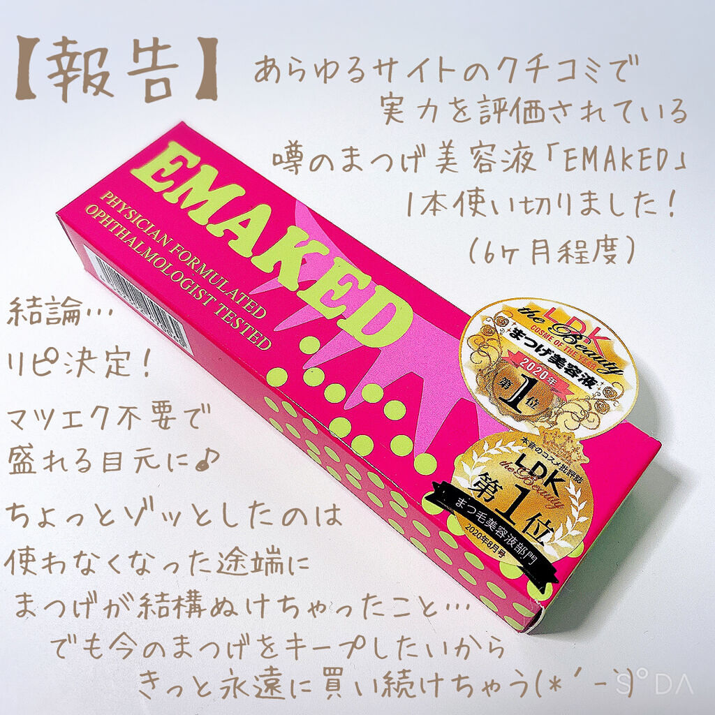 ~EMAKED✨𖠶ˬ𖠶✨~使用開始から丸4ヶ月が経ちましたのでまた経過を記録に残したいと思います🙇♂️~使用頻度~使用2ヶ月までは、とにかく変化が楽しくて欠かさず塗ってました🤣3~4ヶ月目は塗らずに寝落ちした日も何度かありましたが、それでも...