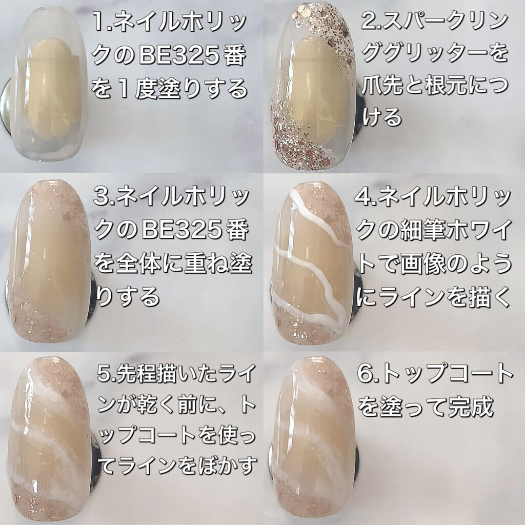 ワンカラーでも指ごとに色を変えるだけでオシャレに見えます💕 画像のようにゴールドラインとストーンを少し足すだけで華やかさがアップ🥰 何度かご紹介したことのあるスポンジで作るグラデーションです✨ スポンジを使うことで境目が綺麗に馴染んでくれます💕 アルミホイルの上でブラウンとトップコートを1:1くらいで混ぜたものを、トップコートのハケに取って3箇所に塗るだけ👌 事前に混ぜたものを塗ることで、爪の上でぼかすより簡単に出来ます💕 ベースカラーが乾く前に点置きしてぼかすことで綺麗にぼかせます✨ スピードが大事なので、使うポリッシュのキャップは全て開けておきましょう😊 天然石のラインはガタガタの方がより天然石っぽく見えるので、ラインを描くのが苦手な方でも大丈夫🙆♀️ 難しそうに見えて、やってみると意外と簡単に出来ます♡
