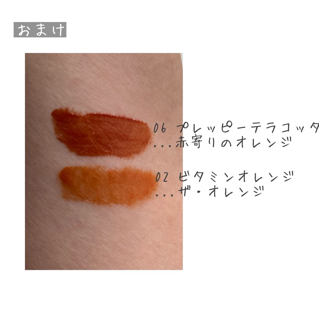 また、保湿力があるところがお気に入りです。唇が乾燥しやすい方にはおすすめです🌷 ティントなのでツヤ系リップに比べると落ちにくいですが、他の「落ちにくい」を推してるティント系と比べると若干落ちやすく感じました。 02.ビタミンオレンジ ...ザ・オレンジ!って感じの色🍊 イエベさんにぴったりだと思います。 03.メローピンク ...可愛いらしいピンク🎀 私にはピンクは似合わない!と思っていたのですが、青みが少なくすごく使いやすかったです。 04.ミーハーレッド ...現時点で発売されている色の中では一番赤みがある色です。大人っぽく見せたい日にはこれをつけてます◎ 05.アンティークローズ(限定品) ...メローピンクと同様にピンク系ですが、少しくすんだような色味で大人っぽいピンクです。 06.プレッピーテラコッタ(限定品) ...ちょうどよくオレンジと赤が混ざった感じで使いやすいです。写真だと02 ビタミンオレンジに似ていますが、それよりは赤みがあります❤️