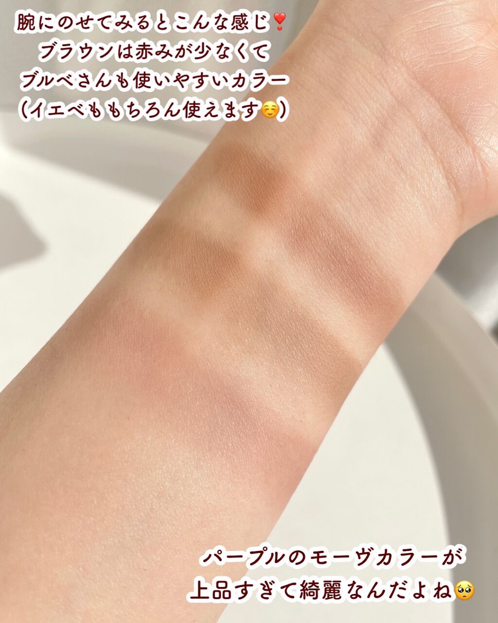 コレはモテ確定のアイシャドウと私の中で決定した 左上: 偏光パールがチラつく珍しいピンクカラー 右上:ホワイトやピンクのラメが煌めくカラー 真ん中: 柔らかいパール入りのベージュ 左下:シアーな赤。少し温かみのあるコーラル感も感じます 右下:マットカラーの赤みのあるブラウン これはね、動画でも伝わらないぐらいラメが繊細で可愛いんだよね😍 女の子らしさが溢れんばかりの儚げピンク💗