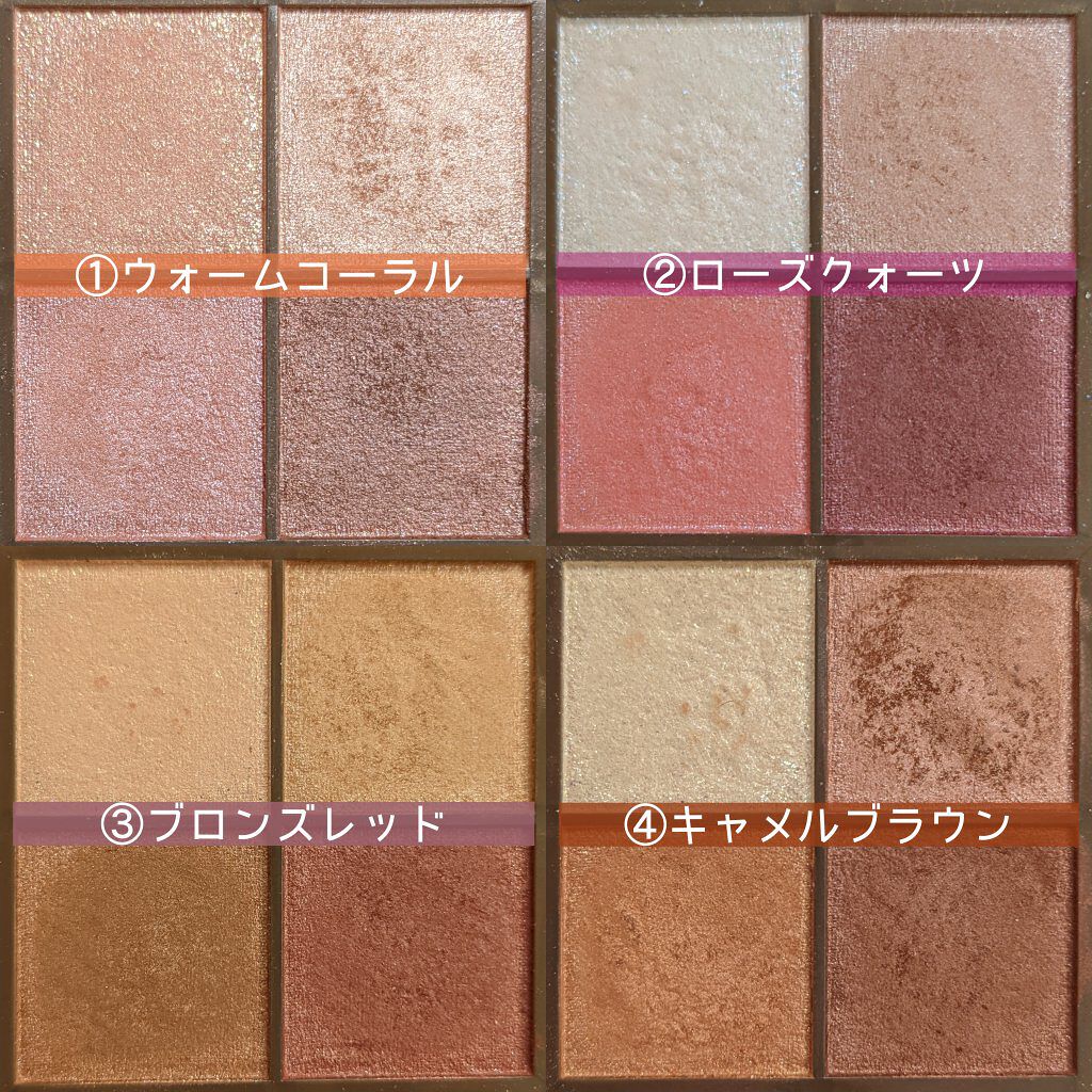 人気の4色パレットの色を全色比べてみました🙌 ナチュラルメイクにおすすめのシャドウ!肌なじみが良いので、何度重ねても柔らかな陰影を作ってくれます♡ 陰影をくっきりはっきりと作ってくれる!目元をくっきりと見せたい時に使いやすいカラー