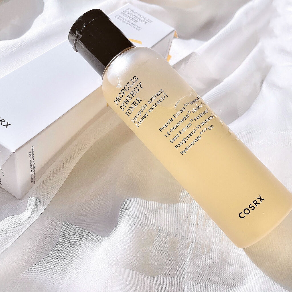 COSRXの特徴といえばプロポリスエキス~🐝 保湿効果や油分と水分のバランスを整える効果が期待できます💡 COSRXを使うと、美容液なしでも もちもちのツヤ肌になれてお気に入りでした🥹 少しとろみのあるテクスチャで2~3回重ねて使うとより保湿感が増されて良い感じです!