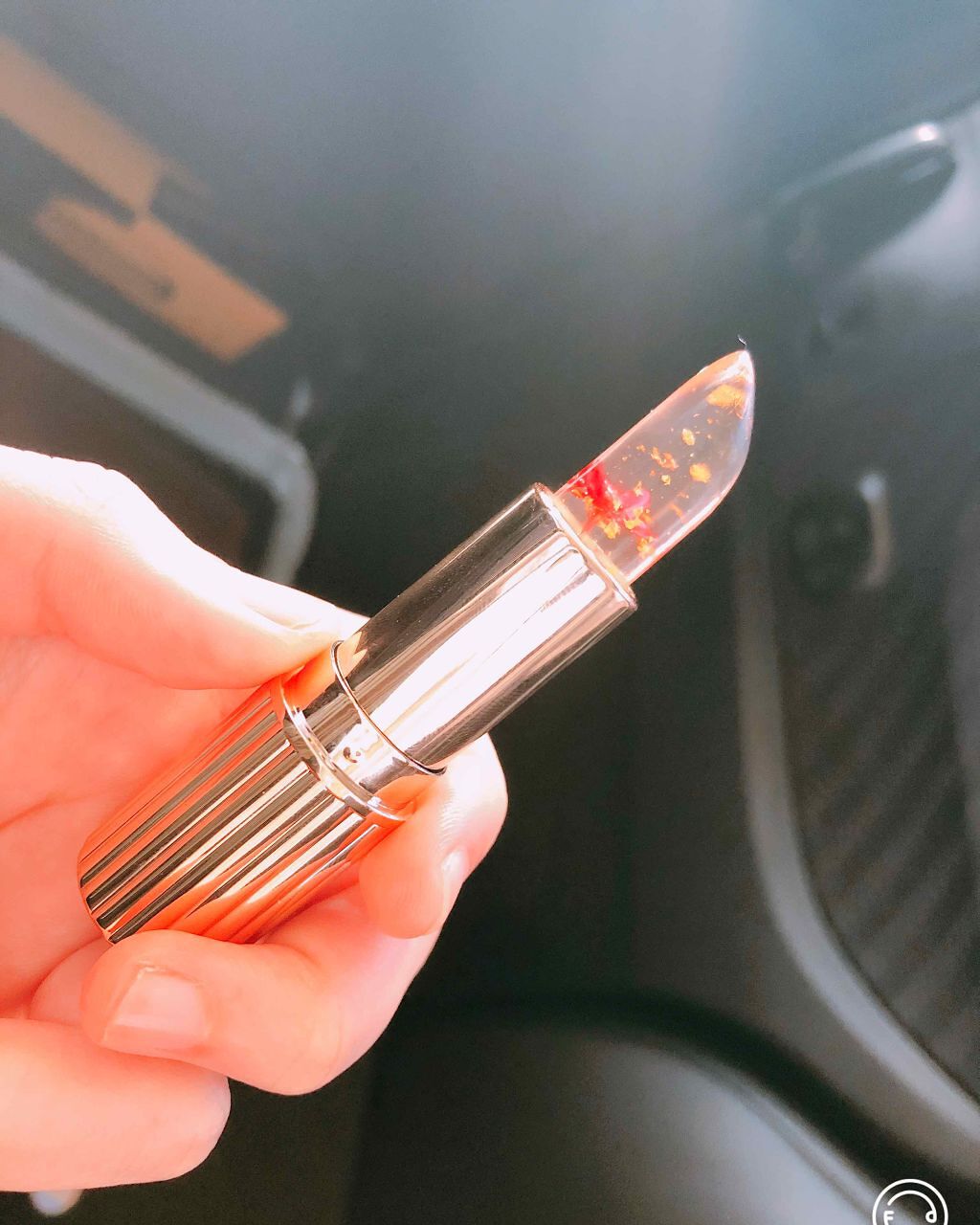 - 透明なリップスティックの中にドライフラワーと金箔が入っているPHや唇の水分量によって発色が変わるティントリップ。長時間しっとり潤う唇をキープして発色長持ち。※すべて同じ色に発色します。