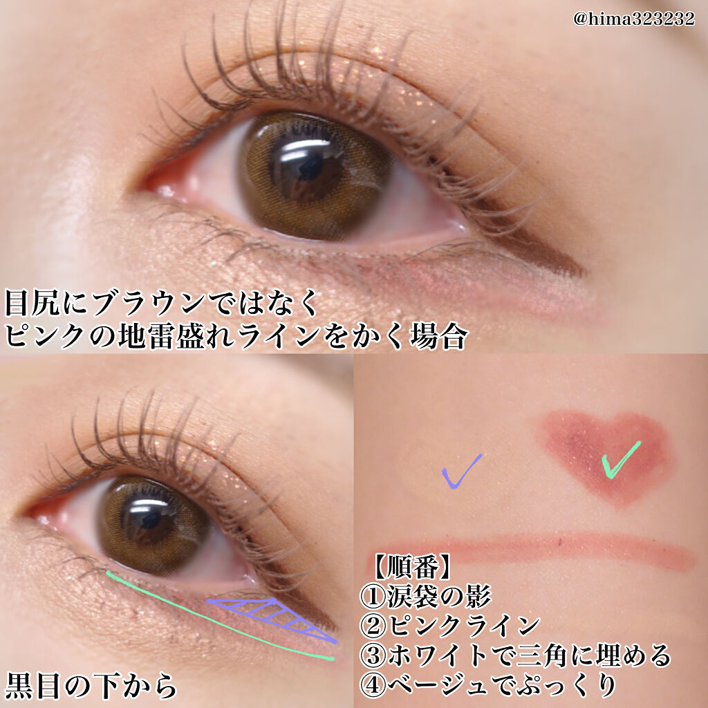【ぷっくり可愛い涙袋の作り方♡】今日は涙袋の作り方についてまとめてみました❣️以下作り方です!ご参考ください*ˊᵕˋ*1️⃣影を描く 三角ゾーン&黒目下に、涙袋の影をオン! パーソナルカラーやメイクの雰囲気に合わせて色をチョイス。 私はsni...