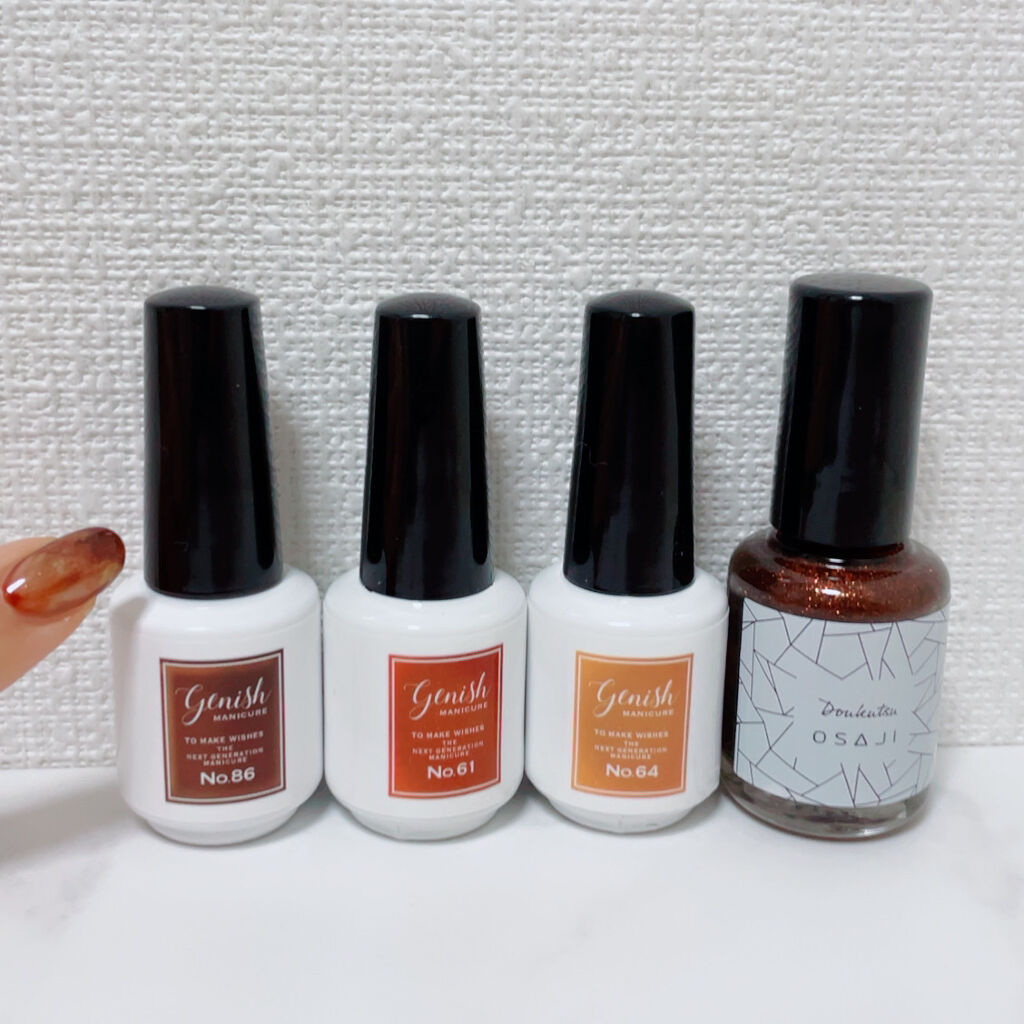 ジーニッシュマニキュアメモ🐱NO.64『オールドアンバー』2度塗り色はとてもかわいくて大好きだけど塗るのが難しいので★4にしました😭1度塗りではかなりムラになったけど2度塗りでジェルみたいに厚めに塗ったらそこまでムラは気にならなくなりました🙌...