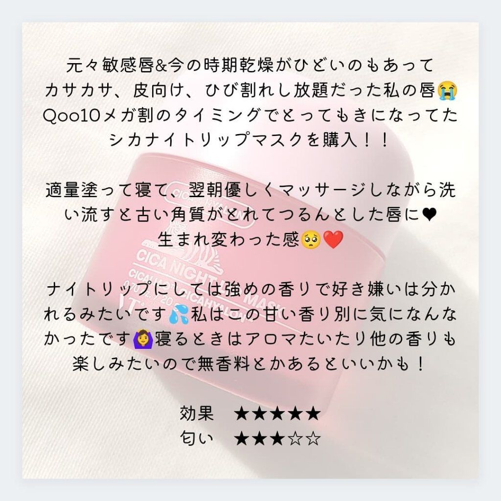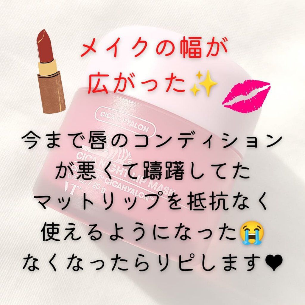 VT▶︎CICAナイトリップマスク ¥1,758(税込)冬だけじゃなく夏はクーラーで乾燥する〜😱ってことでLIPSでナイトリップマスク購入〜🙌寝る前にサッと塗って朝までうるおいキープ♡少量で伸びがよくコスパも◎(※スパチュラはついてません🙅...
