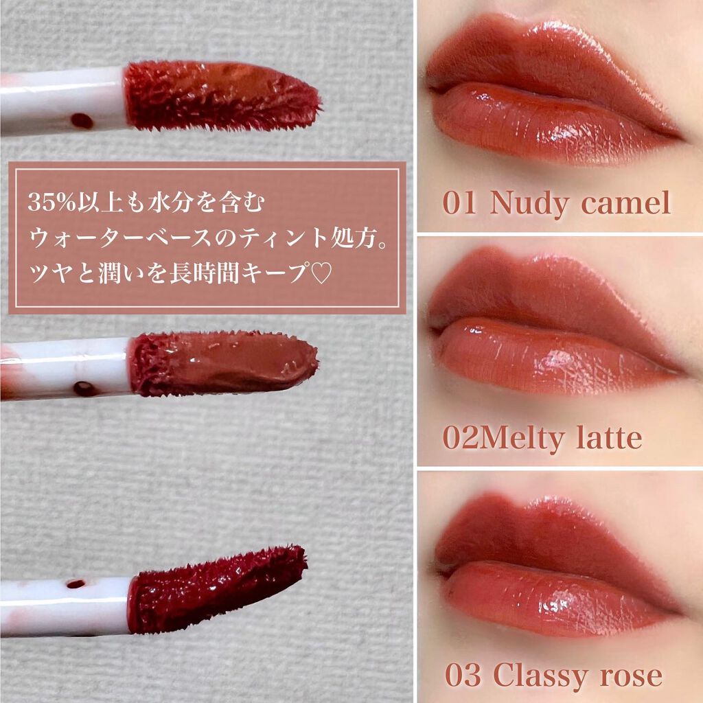 ぷっくりちゅるんとしたみずみずしいツヤ感がかわいい! 長時間色落ちしにくいティント効果もありました。 カラーはどなたでも使いやすいニュートラルなベージュを基調とした3色の展開で、ナチュラルな血色感を与えてくれますよ😉🌸