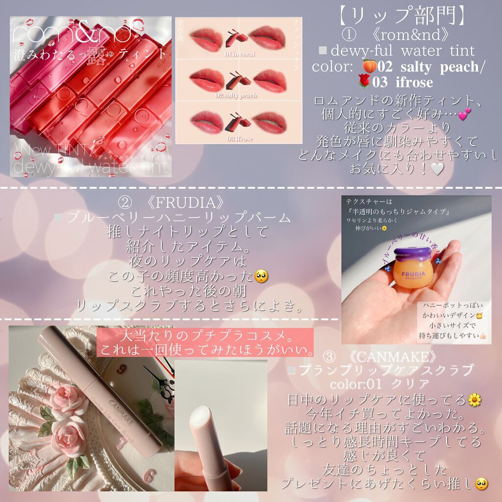 《rom&nd》▫️dewy-fulwatertint(デュイフルウォーターティント)color:🌷𝟎𝟏𝐢𝐧𝐜𝐨𝐫𝐚𝐥/🍑𝟎𝟐𝐬𝐚𝐥𝐭𝐲𝐩𝐞𝐚𝐜𝐡/🌹𝟎𝟑𝐢𝐟𝐫𝐨𝐬𝐞/🌶𝟎𝟒𝐜𝐡𝐢𝐥𝐢𝐮𝐩/🎀𝟎𝟓𝐭𝐚𝐟𝐟𝐲/🎟𝟎𝟔𝐭𝐡𝐮𝐥𝐢𝐚𝐧rom&ndの...