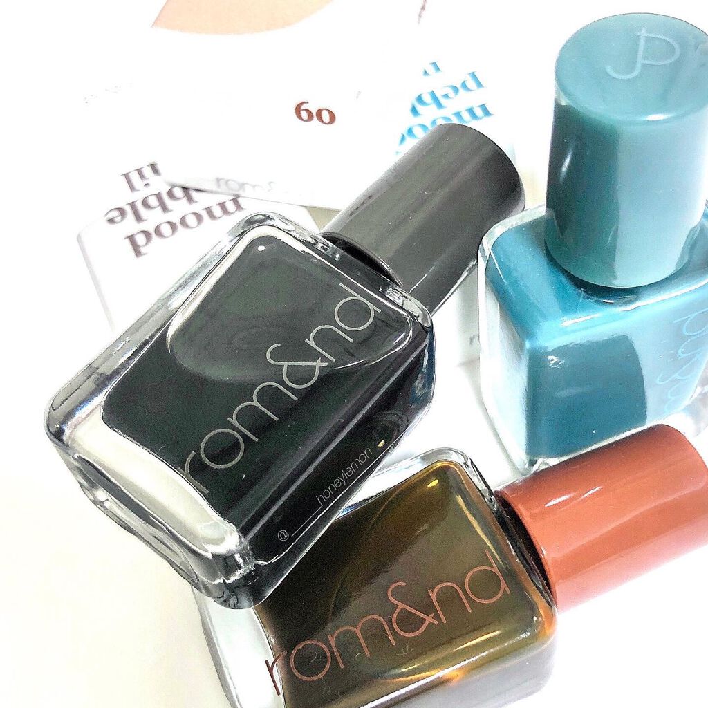 - 指先に玉石のような、ならかな光沢をとどめる。塗った瞬間から綺麗なツヤと光沢を維持し、重ねて塗っても透き通ったカラー感を鮮やかにとどめる、素早い乾燥力のナチュラルカラーネイル。「ロムアンド」の次世代型ネイルです。