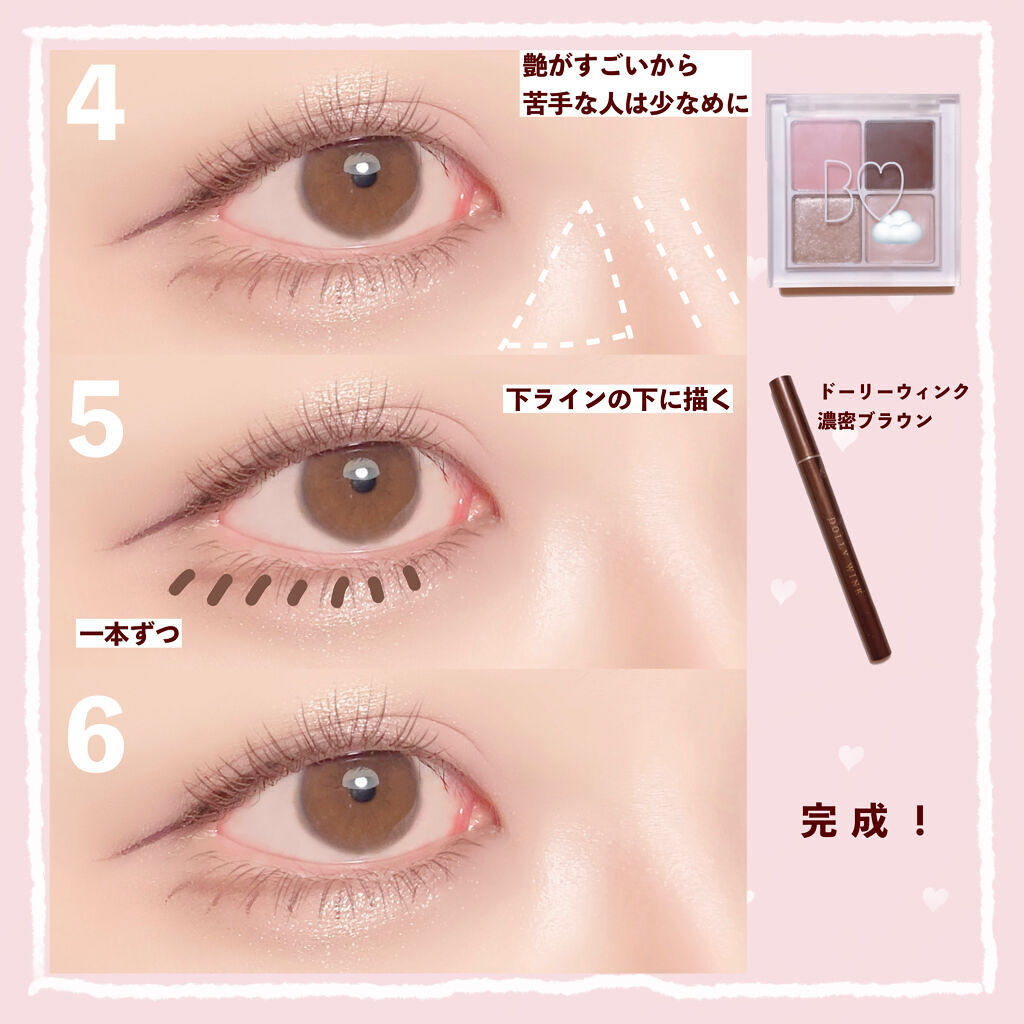 ・涙袋の影の部分まで、ベースを塗ることで縦幅がかなり強調されて丸目にみえる! ・アイシャドウの陰影とラメのハイライト効果で奥まった目に光を取り込んで出目っぽくみせる! ・淡いピンクのアイシャドウ、艶のようなラメ、細くて短いブラックアイラインが特徴 ・つり目を自然にいかせて、美人な雰囲気になれる! ・単色メイクは簡単そうに見えて難しいけど、ブラシを使うと綺麗なグラデーションになる! ・目の形によって中間色をどこまで入れるか変わるけど「目を開けた時に5mm見える」を基準にする