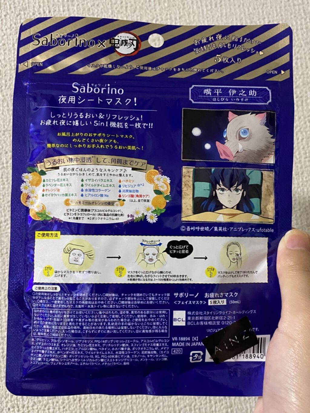 - <鬼滅の刃」×「サボリーノ」5枚> 水、グリセリン、プロパンジオール、ジグリセリン、PPG-14ポリグリセリル-2エーテル、アスコルビルグルコシド、イザヨイバラエキス、オレンジ油、カミツレ花エキス、グリチルリチン酸2K、スフィンゴモナス培養エキス、セイヨウハッカ葉エキス、ハチミツ、ヒアルロン酸Na、ベタイン、ホホバ種子油、ポリクオタニウム-61、メマツヨイグサ種子エキス、ラベンダー花エキス、ワイルドタイムエキス、水溶性コラーゲン、泥炭抽出物、(エイコサン二酸/テトラデカン二酸)ポリグリセリル-10、BG、PEG-60水添ヒマシ油、エタノール、キサンタンガム、クエン酸、クエン酸Na、シクロヘキサン-1,4-ジカルボン酸ビスエトキシジグリコール、メントール、リンゴ酸、トコフェロール、フェノキシエタノール、エチルパラベン、メチルパラベン、香料 <34枚> 水、グリセリン、プロパンジオール、ジグリセリン、PPG-14ポリグリセリル-2エーテル、アスコルビルグルコシド、イザヨイバラエキス、オレンジ油、カミツレ花エキス、グリチルリチン酸2K、スフィンゴモナス培養エキス、セイヨウハッカ葉エキス、ハチミツ、ヒアルロン酸Na、ベタイン、ホホバ種子油、ポリクオタニウム-61、メマツヨイグサ種子エキス、ラベンダー花エキス、ワイルドタイムエキス、水溶性コラーゲン、泥炭抽出物、(エイコサン二酸/テトラデカン二酸)ポリグリセリル-10、BG、PEG-60水添ヒマシ油、エタノール、キサンタンガム、クエン酸、クエン酸Na、シクロヘキサン-1,4-ジカルボン酸ビスエトキシジグリコール、メントール、リンゴ酸、トコフェロール、フェノキシエタノール、エチルパラベン、メチルパラベン、香料 <28枚入> 水、グリセリン、プロパンジオール、ジグリセリン、PPG-14ポリグリセリル-2エーテル、アスコルビルグルコシド、イザヨイバラエキス、オレンジ油、カミツレ花エキス、グリチルリチン酸2K、スフィンゴモナス培養エキス、セイヨウハッカ葉エキス、ハチミツ、ヒアルロン酸Na、ベタイン、ホホバ種子油、ポリクオタニウム-61、メマツヨイグサ種子エキス、ラベンダー花エキス、ワイルドタイムエキス、水溶性コラーゲン、泥炭抽出物、(エイコサン二酸/テトラデカン二酸)ポリグリセリル-10、BG、PEG-60水添ヒマシ油、エタノール、キサンタンガム、クエン酸、クエン酸Na、シクロヘキサン-1,4-ジカルボン酸ビスエトキシジグリコール、メントール、リンゴ酸、トコフェロール、フェノキシエタノール、エチルパラベン、メチルパラベン、香料 <5枚入> 水、グリセリン、プロパンジオール、ジグリセリン、PPG-14ポリグリセリル-2エーテル、アスコルビルグルコシド、イザヨイバラエキス、オレンジ油、カミツレ花エキス、グリチルリチン酸2K、スフィンゴモナス培養エキス、セイヨウハッカ葉エキス、ハチミツ、ヒアルロン酸Na、ベタイン、ホホバ種子油、ポリクオタニウム-61、メマツヨイグサ種子エキス、ラベンダー花エキス、ワイルドタイムエキス、水溶性コラーゲン、泥炭抽出物、(エイコサン二酸/テトラデカン二酸)ポリグリセリル-10、BG、PEG-60水添ヒマシ油、エタノール、キサンタンガム、クエン酸、クエン酸Na、シクロヘキサン-1,4-ジカルボン酸ビスエトキシジグリコール、メントール、リンゴ酸、トコフェロール、フェノキシエタノール、エチルパラベン、メチルパラベン、香料