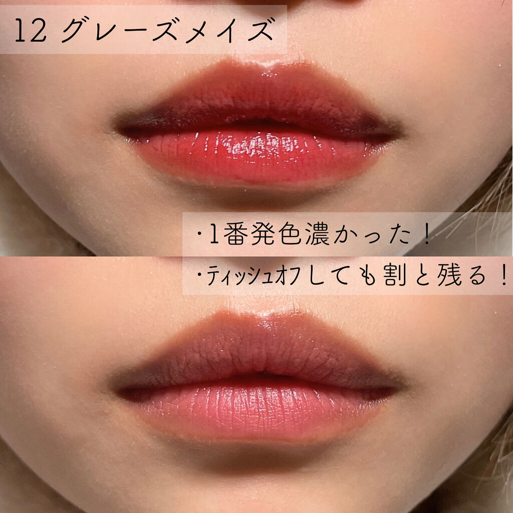 ティッシュオフするとほんとにほんのりオレンジがかってる…?という感じ。イエベ春さん向きかな…?と思いました ティッシュオフしてもツヤ無くなったくらいじゃね?な勢いで変わらない。イエベ春さん向きかな?妹にあげました ティッシュオフするとほんのり色付いてる…?という感じ。ブルベさん向きなのかなぁ、私勉強不足で夏と冬の差がわからんすまん ティッシュオフするとまあ僅かに染まったかな?という程度。元からこの色だが???って顔ができる 多分イエべ秋向け?なのかな?わからんけど ティッシュオフしても若干残るかなぁ?うーん、って感じ ティッシュオフしても割と残る気がする!!