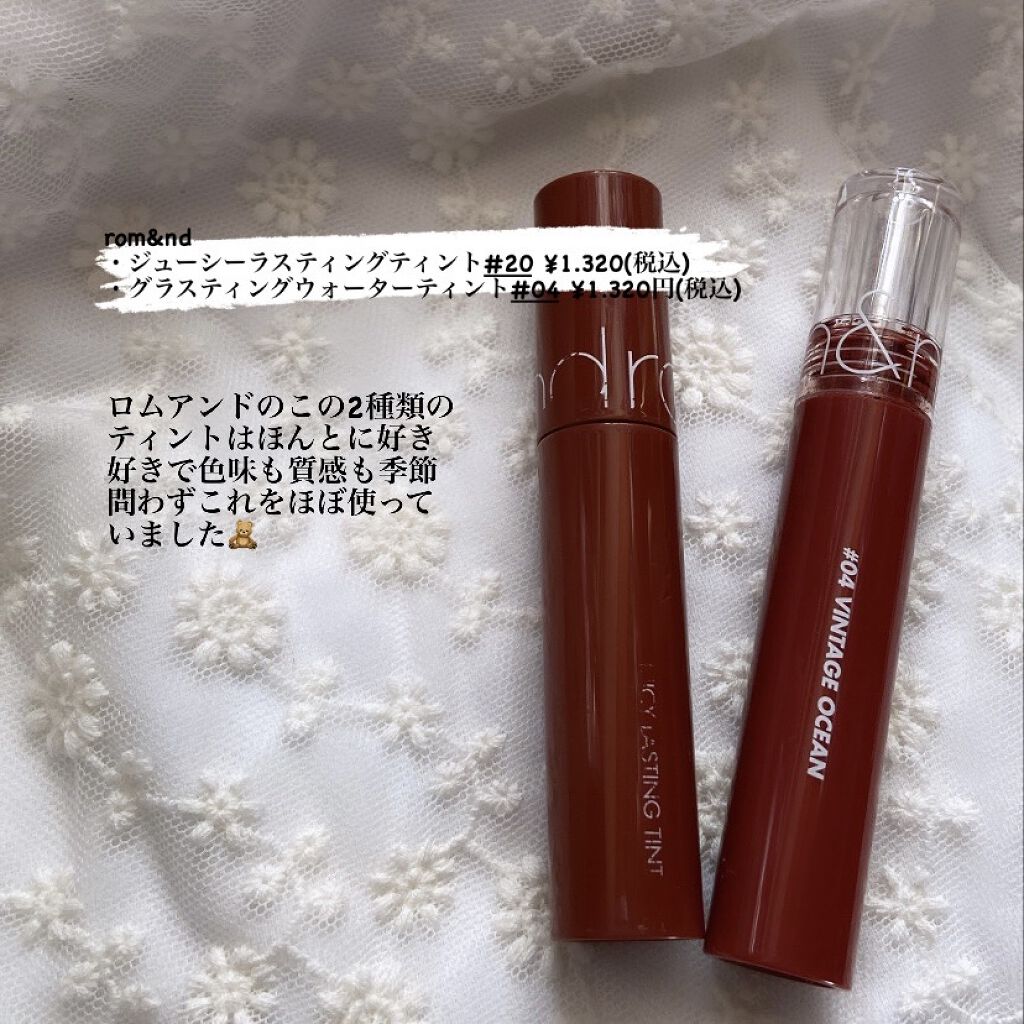 マットリップなのにムースみたいな感じ!というような着け心地の良いタイプのマットリップです。 全25色のカラーがあるので、皆さんそれぞれに似合う色だったり見つかると思うのでもし良かったら買ってみてくださいね🌼 ロムアンドのティントの中で1番ベトベトしなくておすすめのリップです。#𝟎𝟒𝐯𝐢𝐧𝐭𝐚𝐠𝐞 𝐨𝐜𝐞𝐚𝐧は全8色ありますがその中で1番ブラウン味のあるリップです。香りは紅茶のような感じで、このリップは塗布後徐々にツヤが出てき好きなリップです