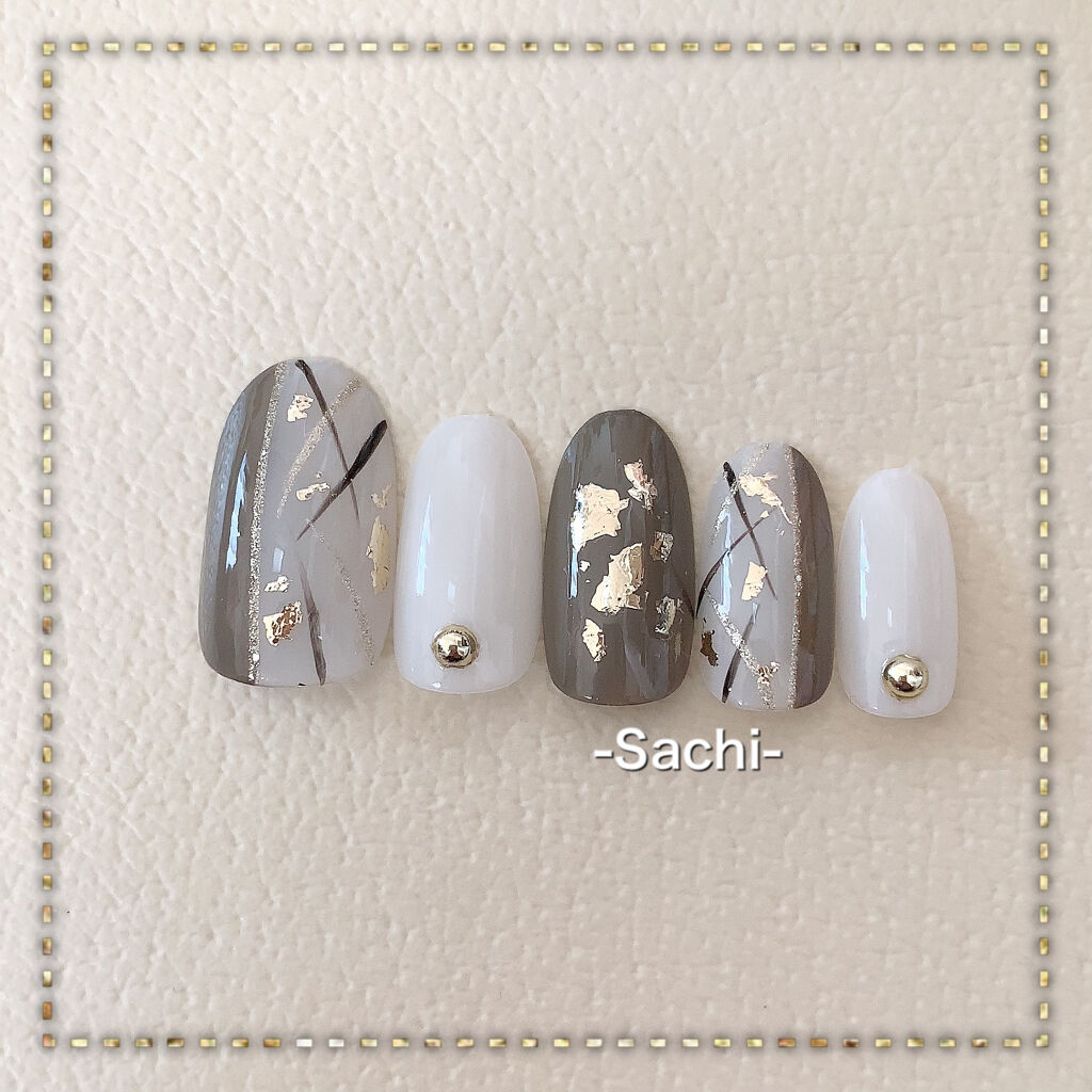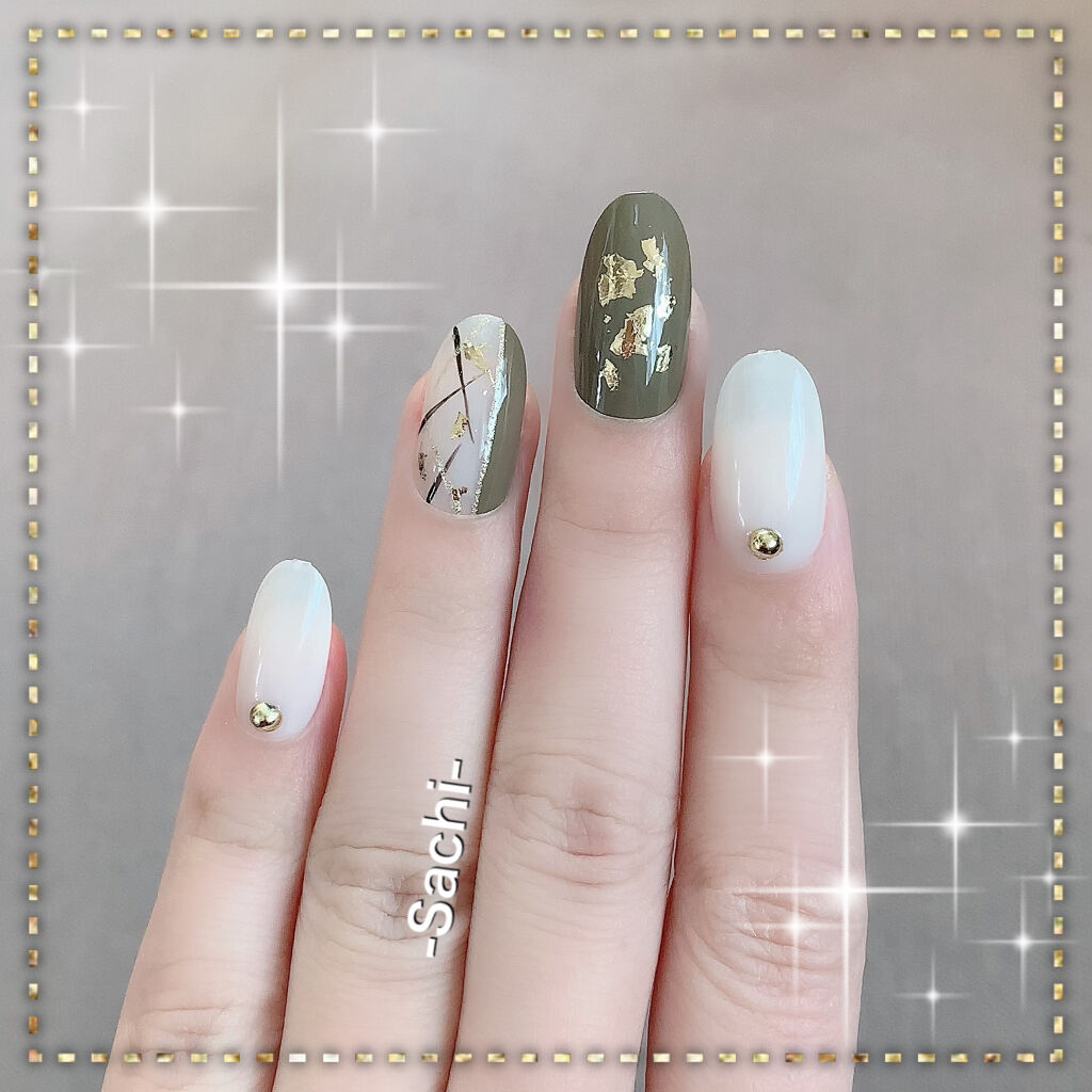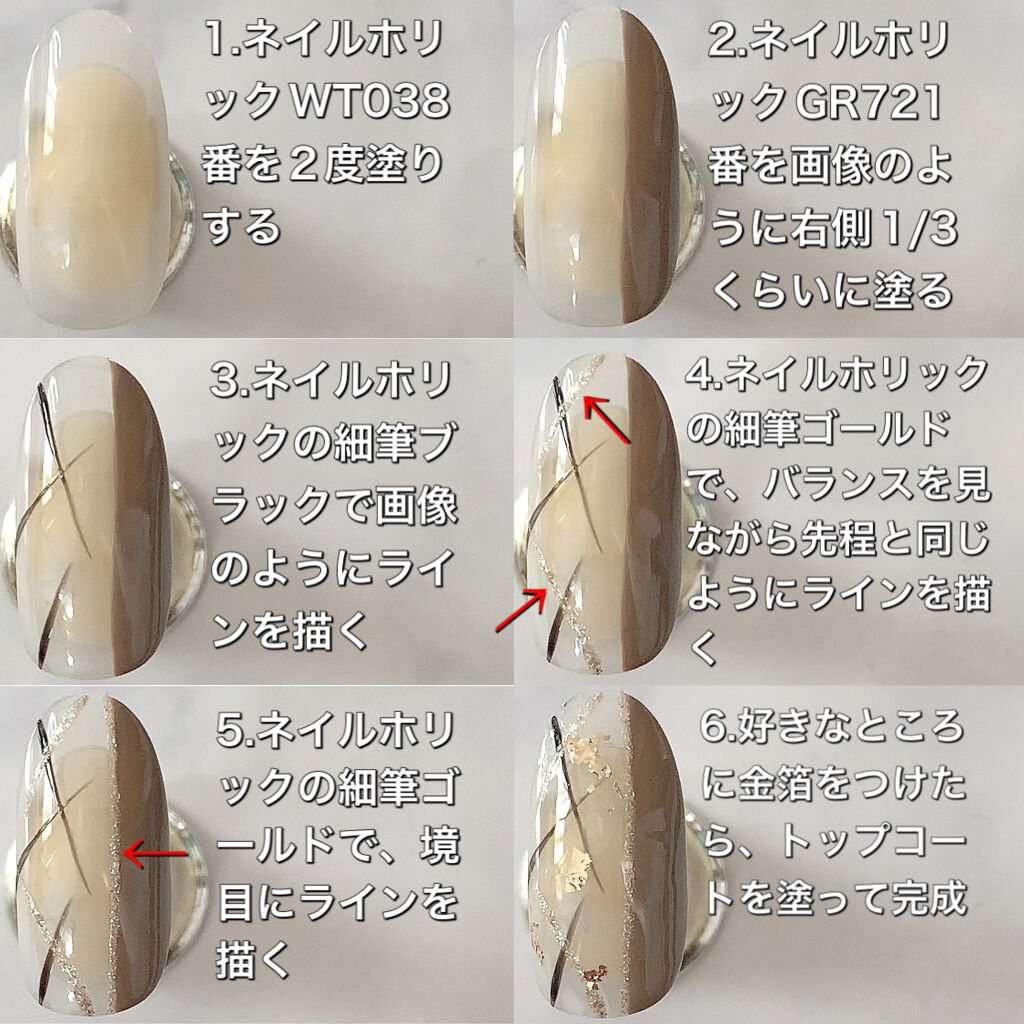 ワンカラーでも指ごとに色を変えるだけでオシャレに見えます💕 画像のようにゴールドラインとストーンを少し足すだけで華やかさがアップ🥰 何度かご紹介したことのあるスポンジで作るグラデーションです✨ スポンジを使うことで境目が綺麗に馴染んでくれます💕 アルミホイルの上でブラウンとトップコートを1:1くらいで混ぜたものを、トップコートのハケに取って3箇所に塗るだけ👌 事前に混ぜたものを塗ることで、爪の上でぼかすより簡単に出来ます💕 ベースカラーが乾く前に点置きしてぼかすことで綺麗にぼかせます✨ スピードが大事なので、使うポリッシュのキャップは全て開けておきましょう😊 天然石のラインはガタガタの方がより天然石っぽく見えるので、ラインを描くのが苦手な方でも大丈夫🙆♀️ 難しそうに見えて、やってみると意外と簡単に出来ます♡