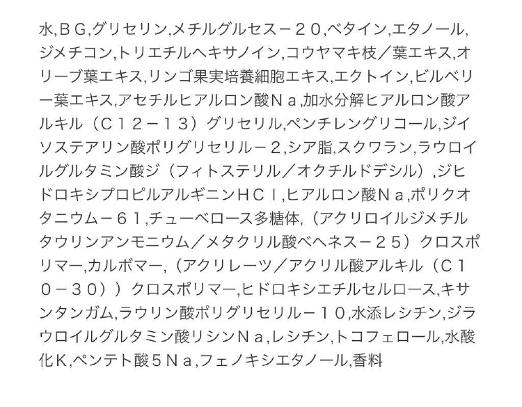 - <40ml> エクトイン、水、ペンチレングリコール、BG、グリセリン、ジメチコン、ヒアルロン酸Na、キサンタンガム、カルボマー、水酸化K、フェノキシエタノール、スクワラン、香料、トコフェロール、エタノール、ビルベリー葉エキス、レシチン、シア脂、トリエチルヘキサノイン、水添レシチン、ヒドロキシエチルセルロース、アセチルヒアルロン酸Na、ベタイン、ジラウロイルグルタミン酸リシンNa、リンゴ果実培養細胞エキス、ポリクオタニウム-61、ペンテト酸5Na、(アクリレーツ/アクリル酸アルキル(C10-30))クロスポリマー、ラウロイルグルタミン酸ジ(フィトステリル/オクチルドデシル)、ジイソステアリン酸ポリグリセリル-2、メチルグルセス-20、ラウリン酸ポリグリセリル-10、オリーブ葉エキス、コウヤマキ枝/葉エキス、(アクリロイルジメチルタウリンアンモニウム/メタクリル酸ベヘネス-25)クロスポリマー、ジヒドロキシプロピルアルギニンHCl、チューベロース多糖体、加水分解ヒアルロン酸アルキル(C12-13)グリセリル