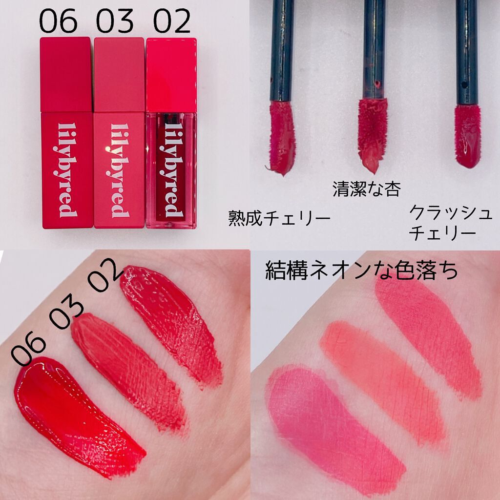 🌻1本500円で買えたlilybyred🌻・ブラッディライアーコーティングティント03クレバーマンガップル・ムードライアーベルベットティント08メロウソフトパーシモン・ジューシーライアーウォーターティント01グアバモヒート質感の違う3種類を選...